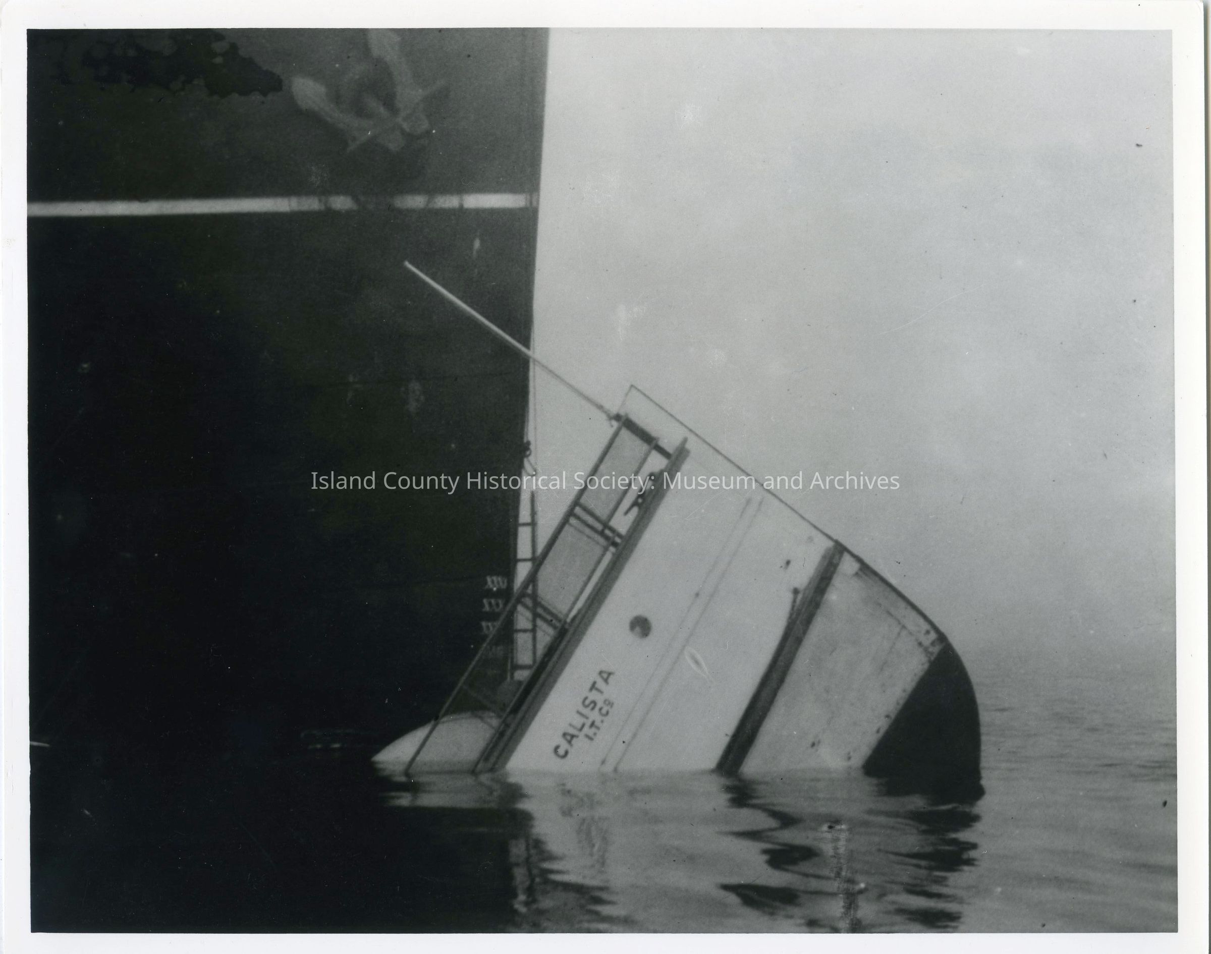 Photograph of the bow of the "Calista" (with the rest of the ship submerged) just before sinking fully under the water. The Calista sank on 27 July 1922 after it was struck by the Japanese freighter ship "Hawaii Maru" (the large black ship to the left of the Calista) off West Point near Seattle.Photograph Details