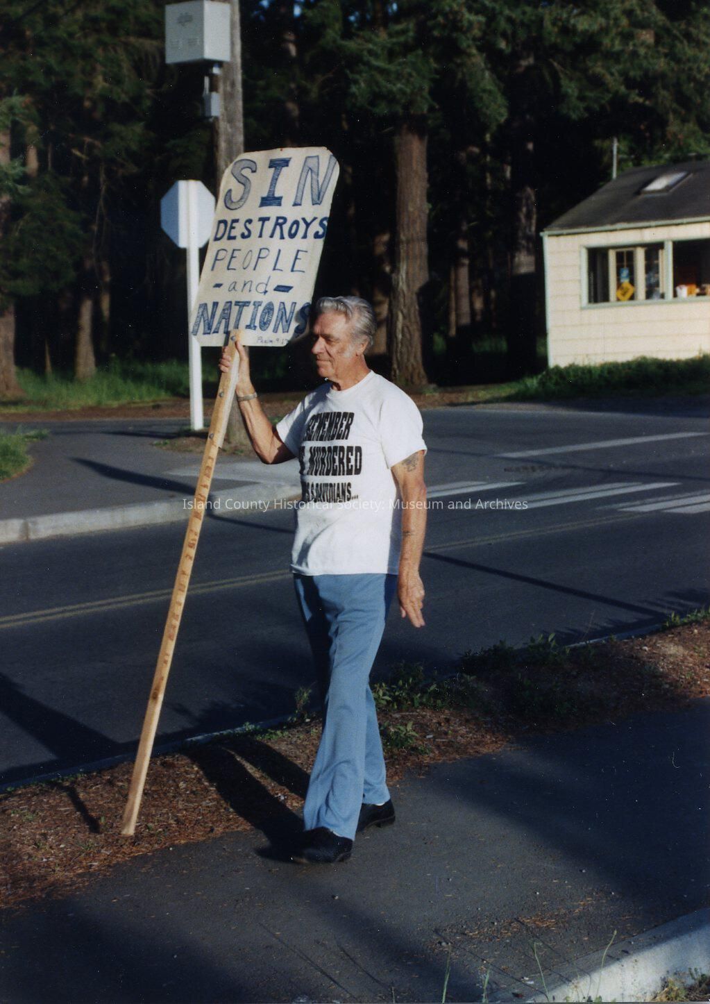 Older male wearing a white shirt with big block lettering and blue jeans. He is standing on a concrete sidewalk next to a road. In the background there is a house visible. He is holding a sign that says "Sin Destroys People and Nation" which is at the end of a long stick.