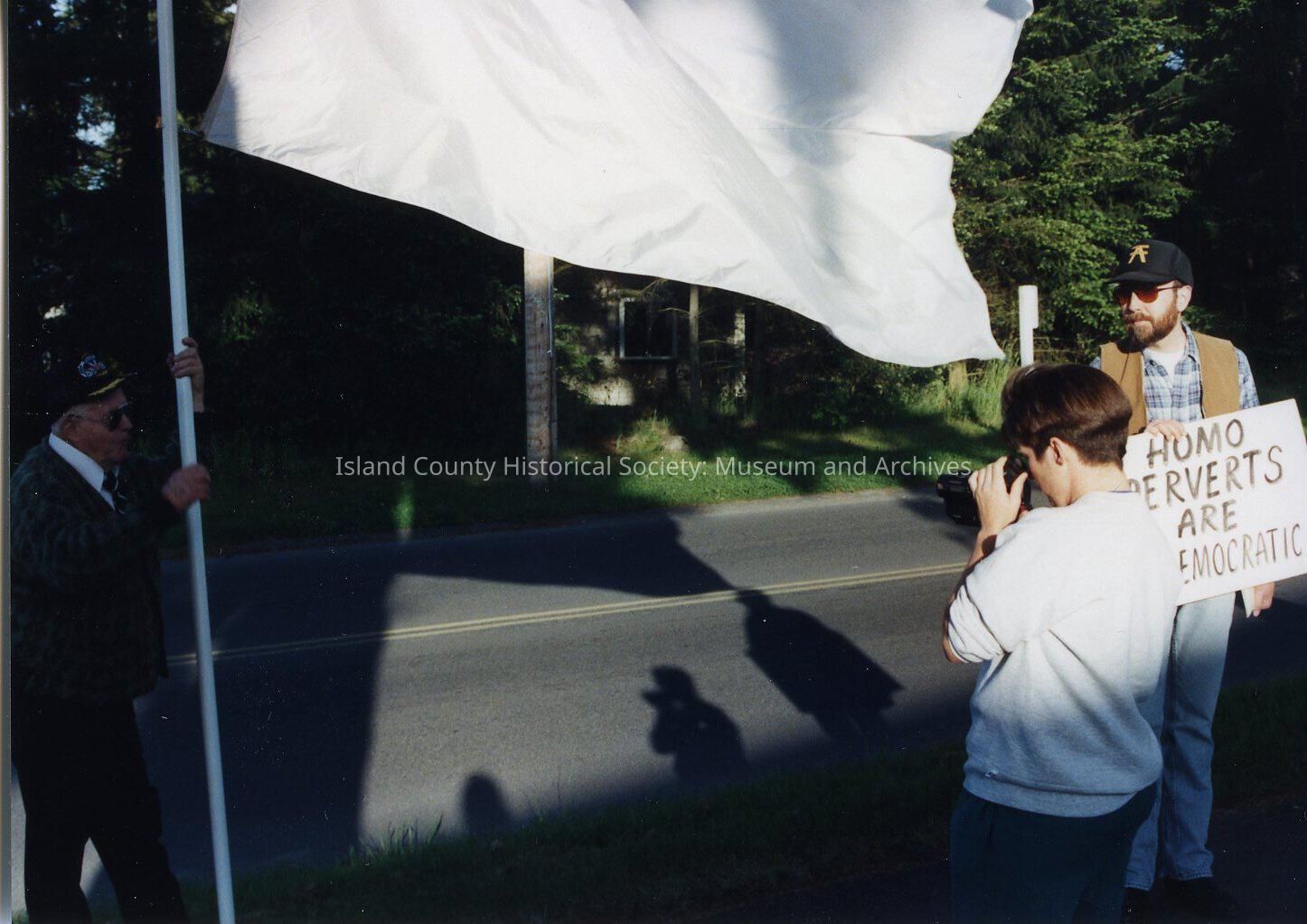 To the left is an older man who is holding a white flag (not shown is the blue square with a red star in the center of the square that is depicted in the left hand upper corner). To the right is another protester who wearing a vest with a sunglasses and a black hat with a sign that says "Homo Perverts Are Undemocratic!" In between these protesters is a another person who is recording them both on a video camera.