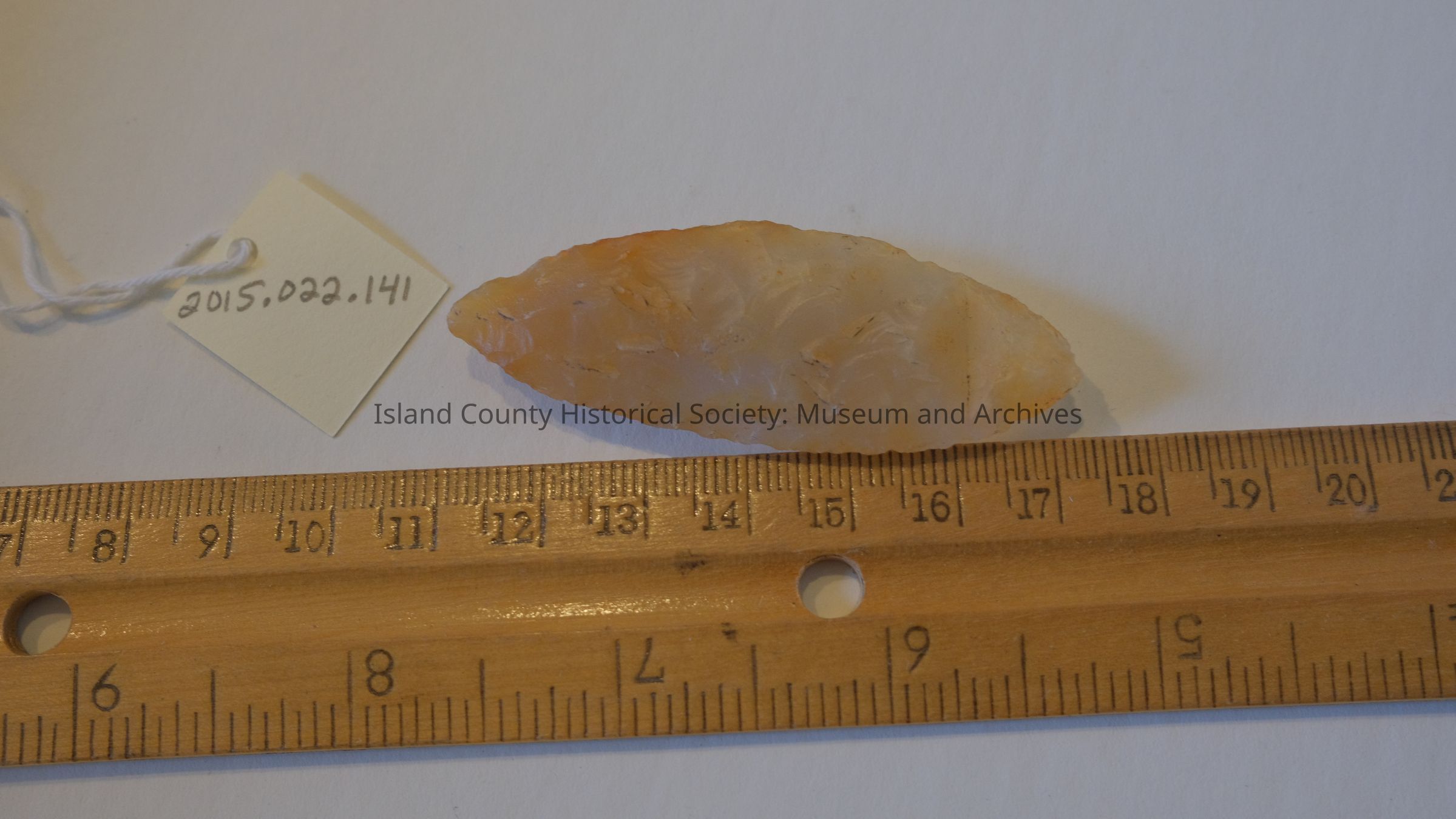 Stone projectile point. Elongated triangular/oblong blade with no base or stem. White and orange in color.