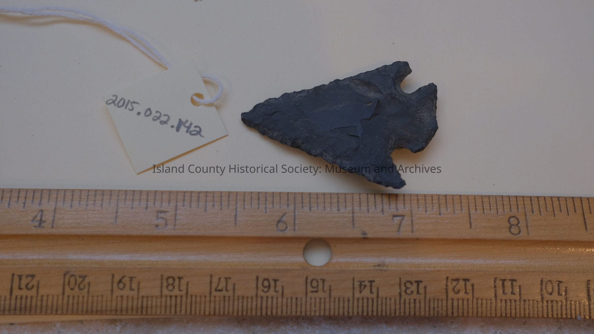 Projectile point. Triangular shaped blade, corner notched expanding stem with straight base - chipped, inversely tapered barbs. Dark grey/black in color.Lexicon