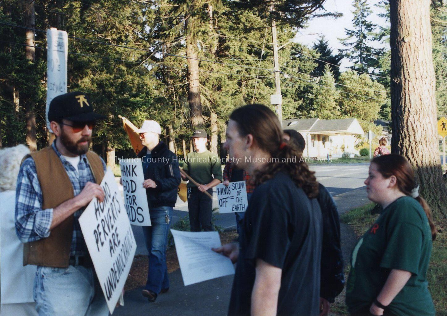Many protesters are seen talking to onlookers. The signs that are visible say "Homo Perverts Are Undemocratic", "Thank God For Aids", and "Hands Off = Scum Of The Earth". In the background the protesters are walking together on the side walk next to a road.