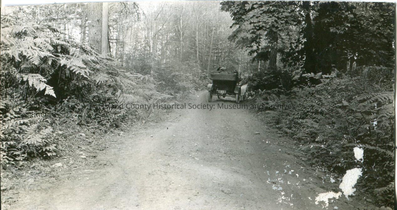 Photo shows early travel on Whidbey Island. Exact location not noted. A distance angle of the rear of an automobile pulled off on the side of the dirt road.