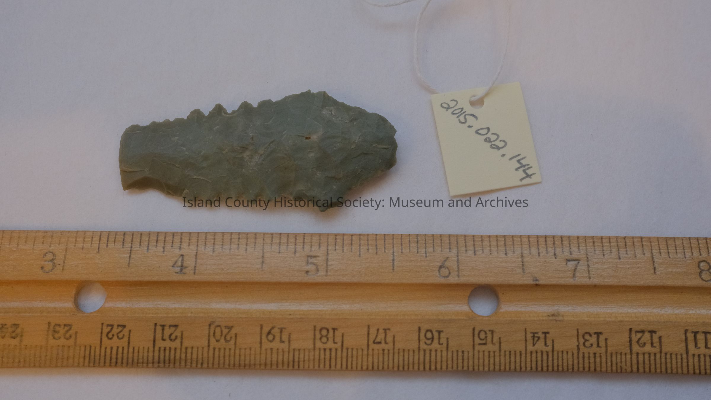 Projectile or spear point. Elongated triangular shape with tip broken off. Serrated edges. Contracting stem. [Appear this point was possibly still under construction when broken and therefore not completed.]