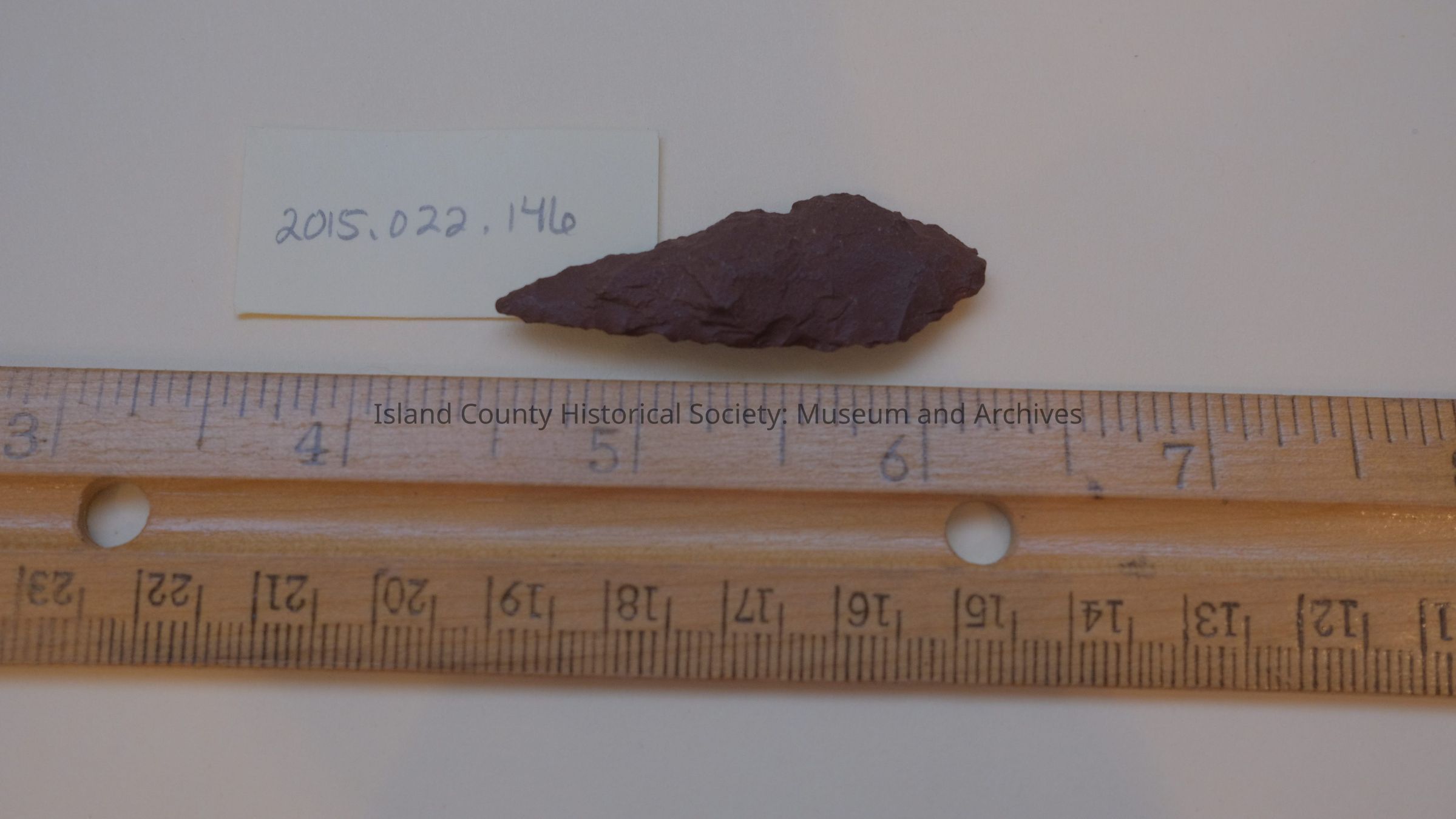 Projectile point. Triangular shaped blade with contracting base. Medium brown in color.