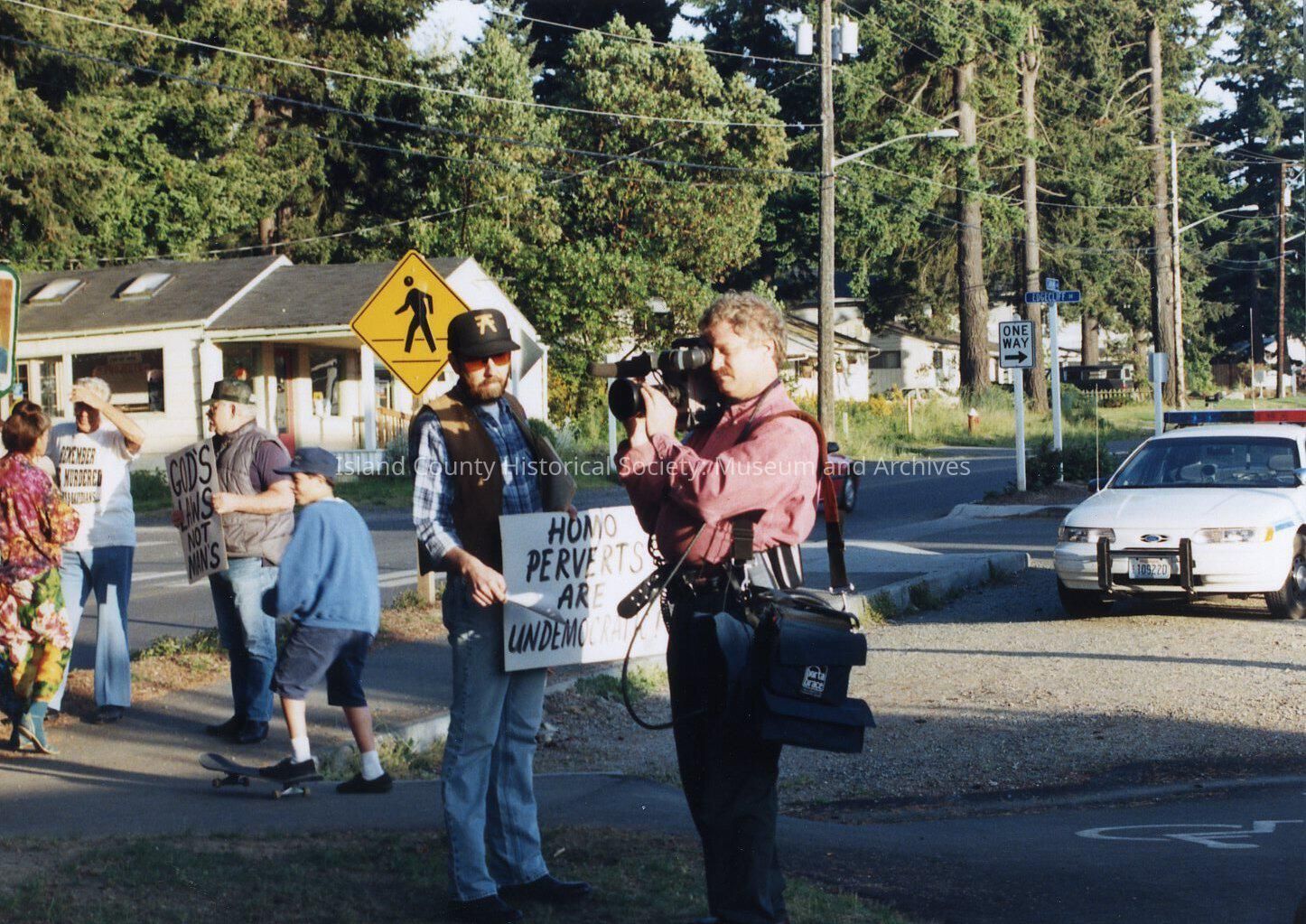 News crew covering the protest. Man is holding a video camera while one of the protesters is onlooking. The protesters is holding a sign that says "Homo Perverts Are Undemocratic". In the background you can see other protesters as well as a cop car.