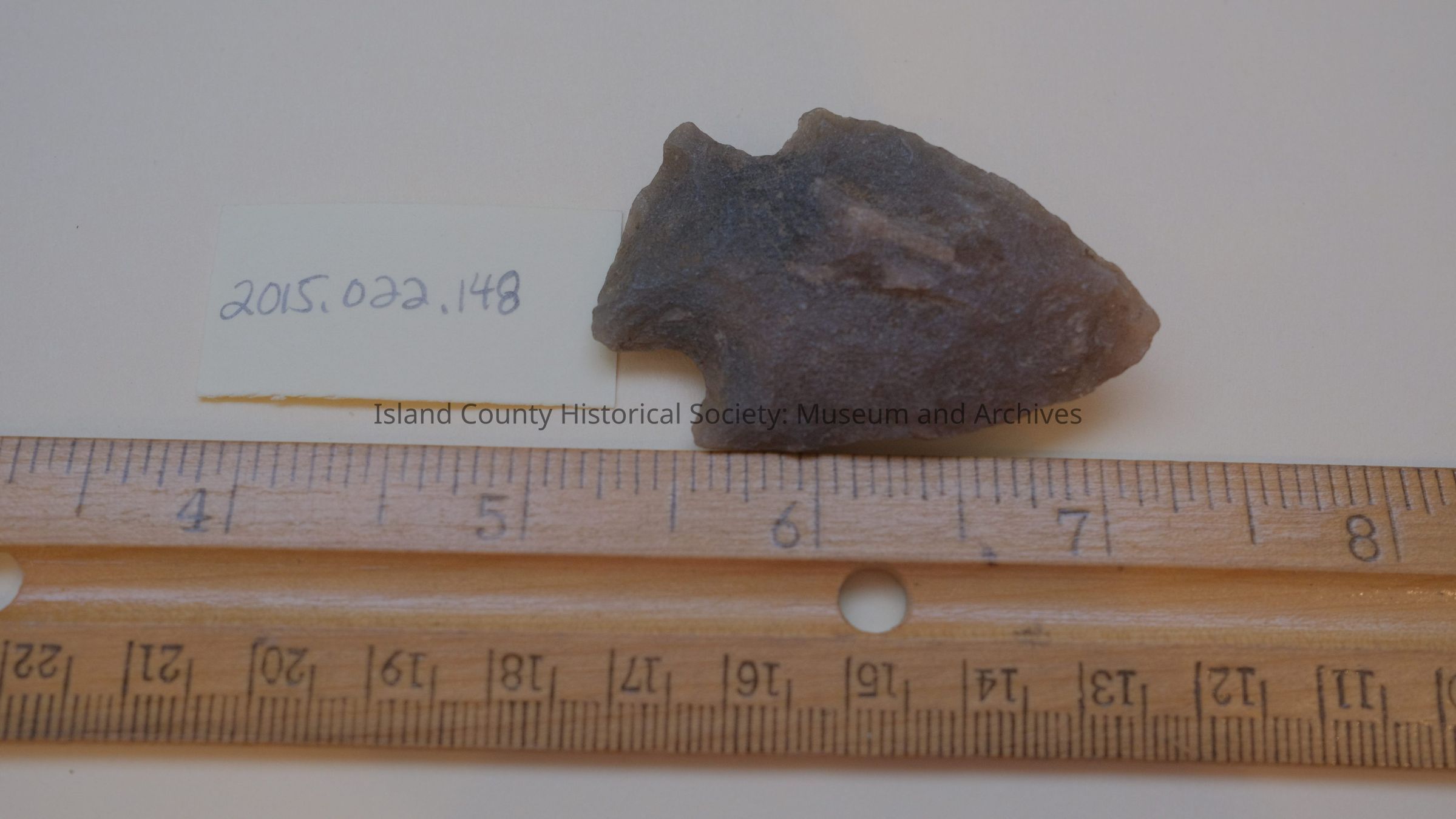 Projectile point. Triangular blade, corner notched expanding stem with convex base, horizontal notched barbs.