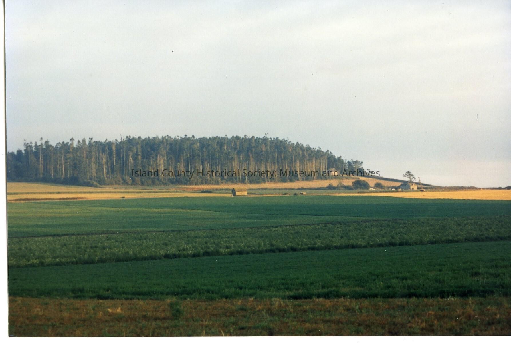 Picture shows Ebey's Prairie with the Ferry house in the background. Crops are planted and are green. Old historic barn near Ebey's Ferry house.