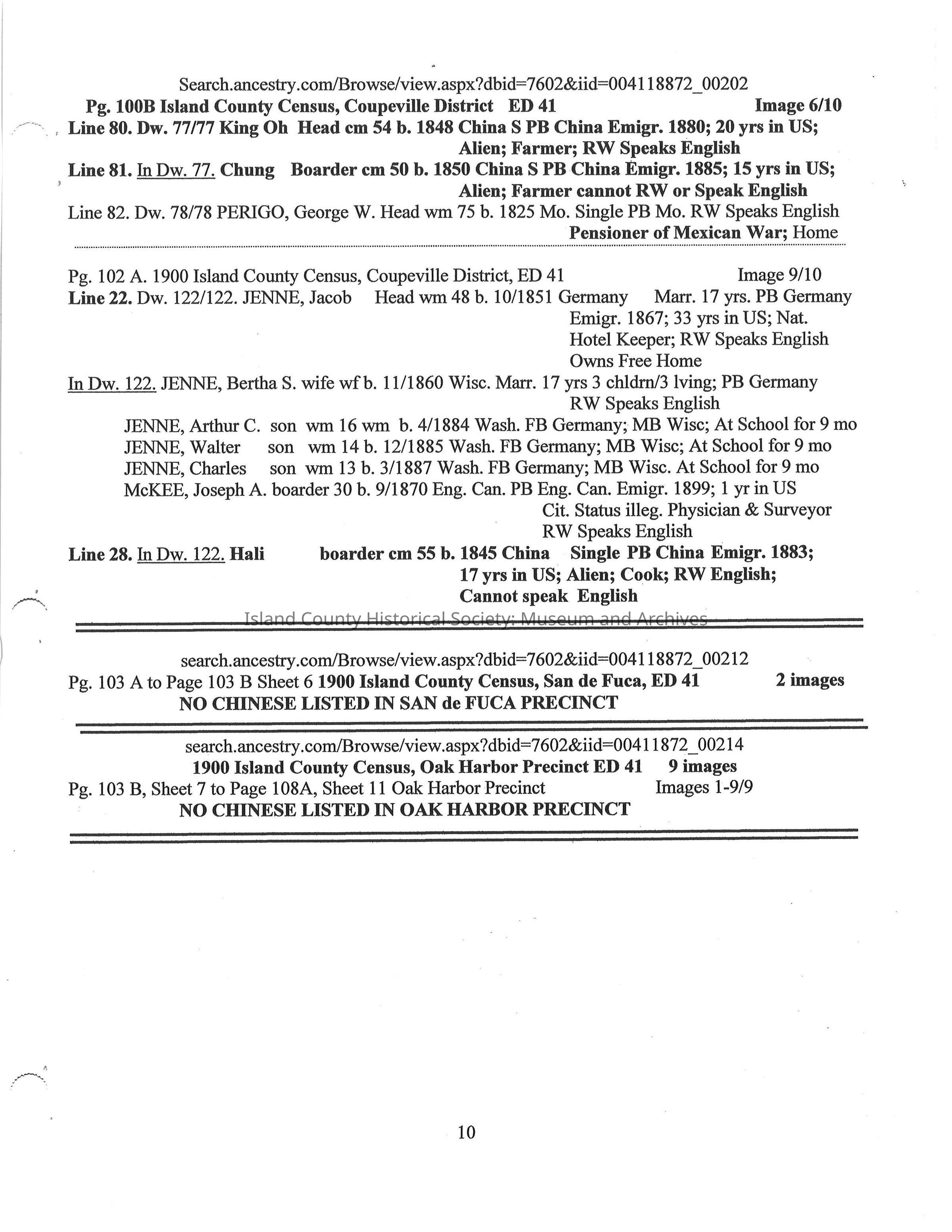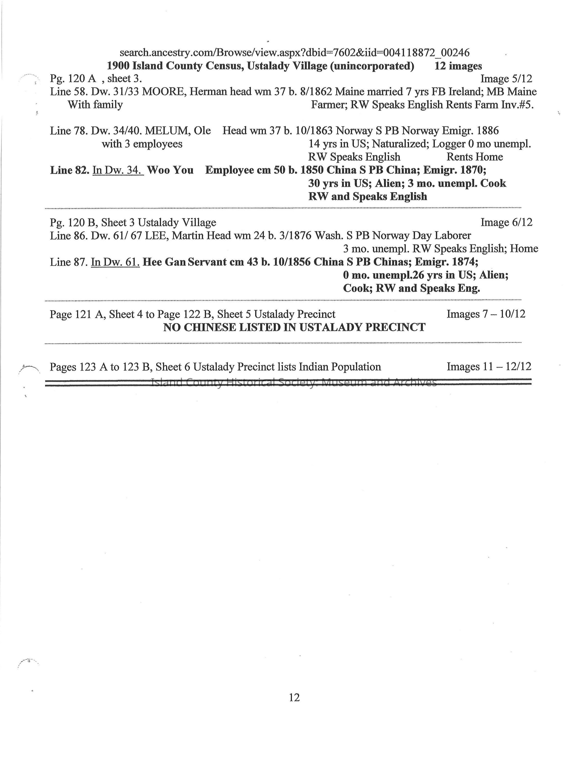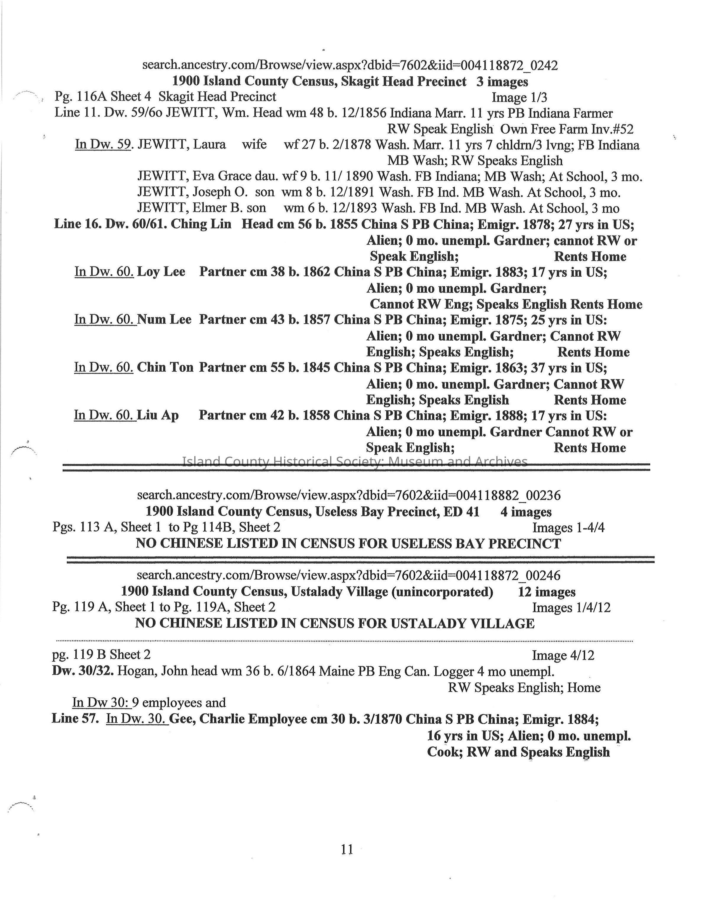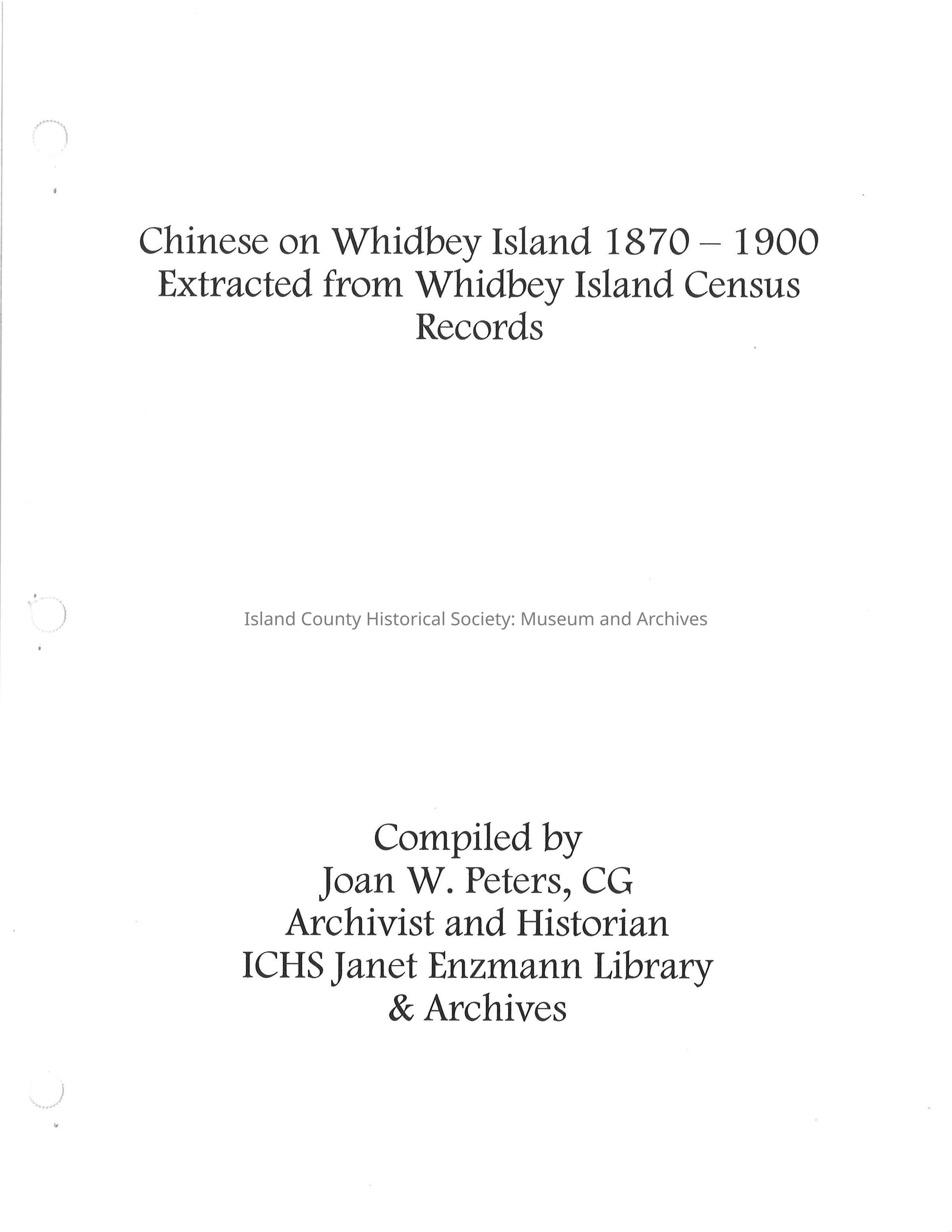 Compilation on the Chinese on Whidbey Island 1870 -1900 extracted from Whidbey Island Census Records