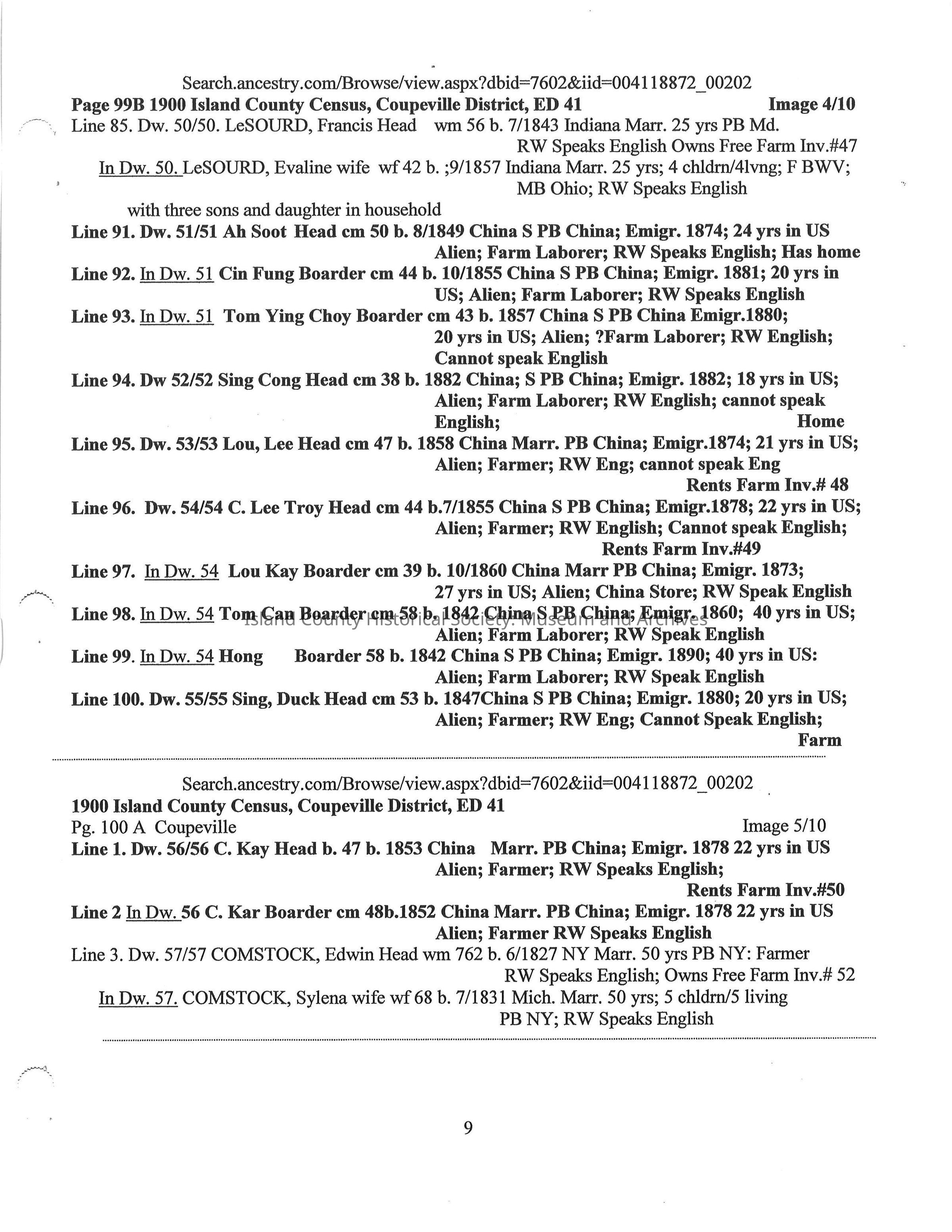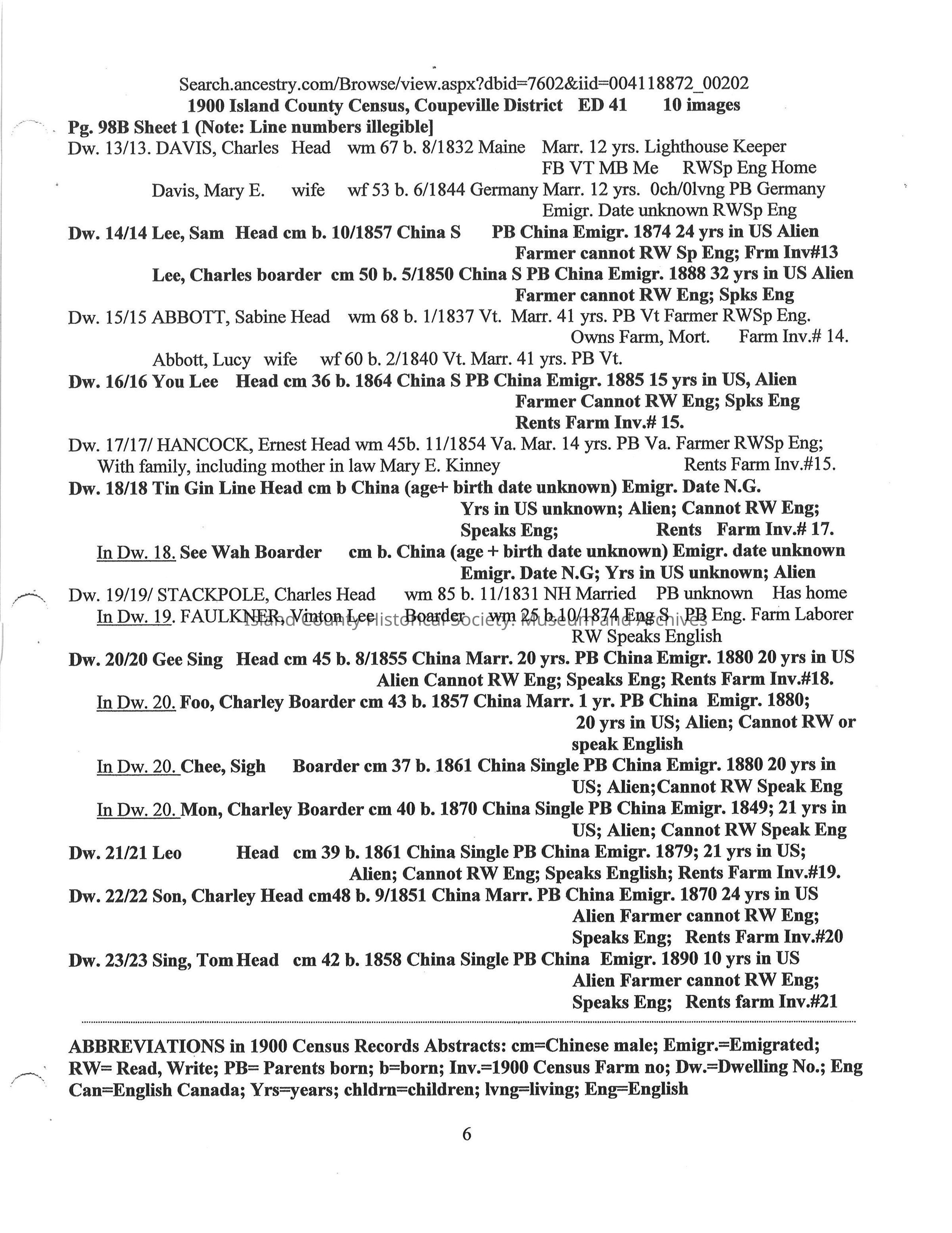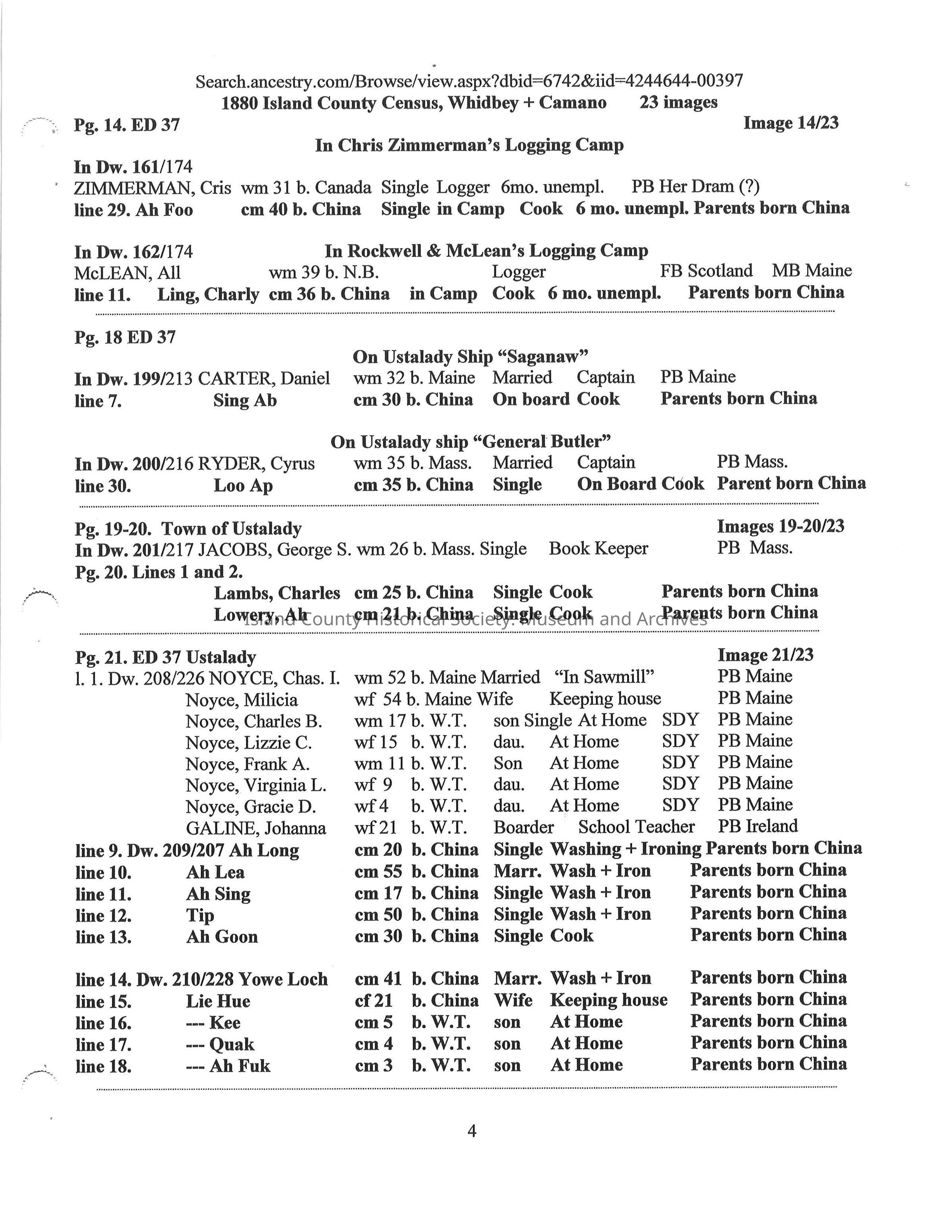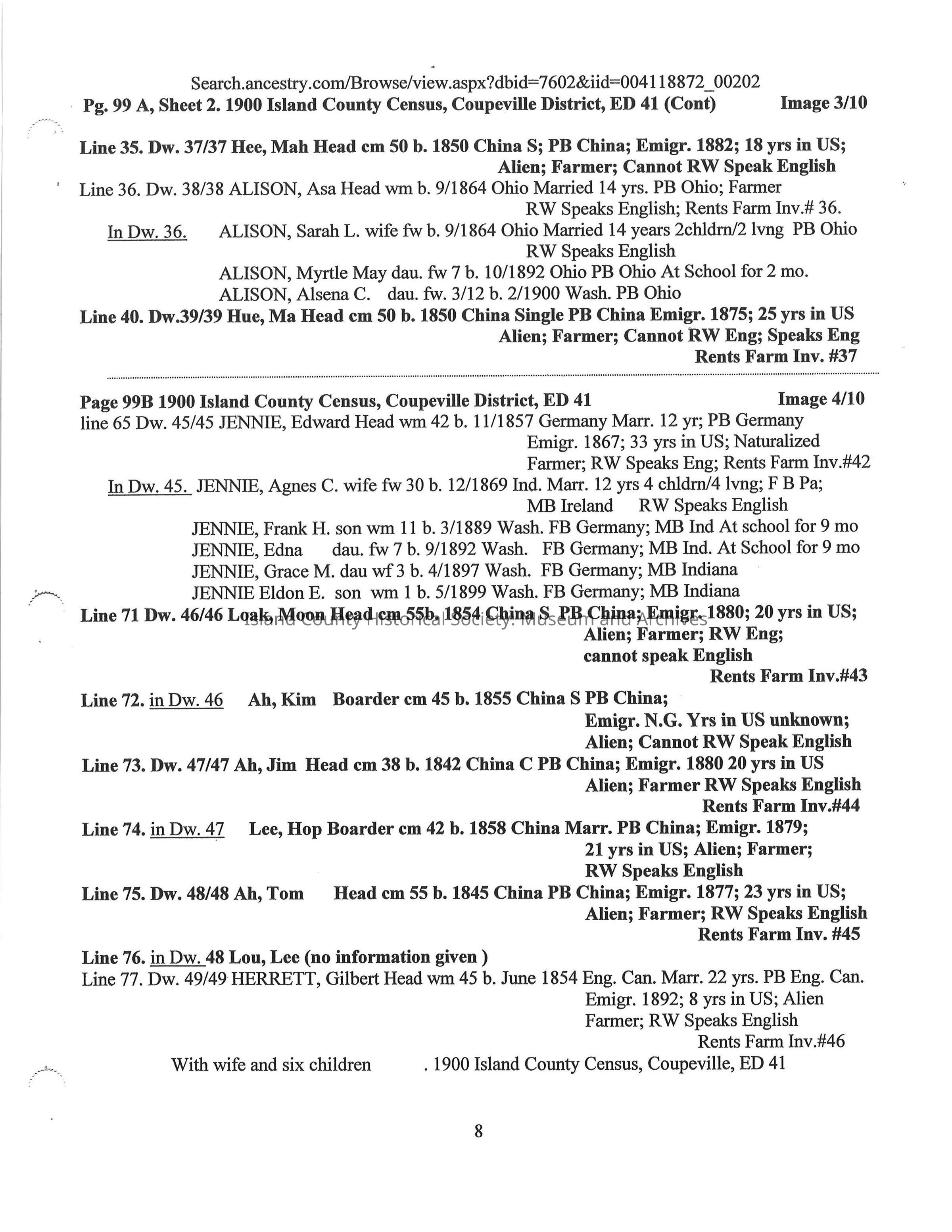 Compilation on the Chinese on Whidbey Island 1870 -1900 extracted from Whidbey Island Census Records