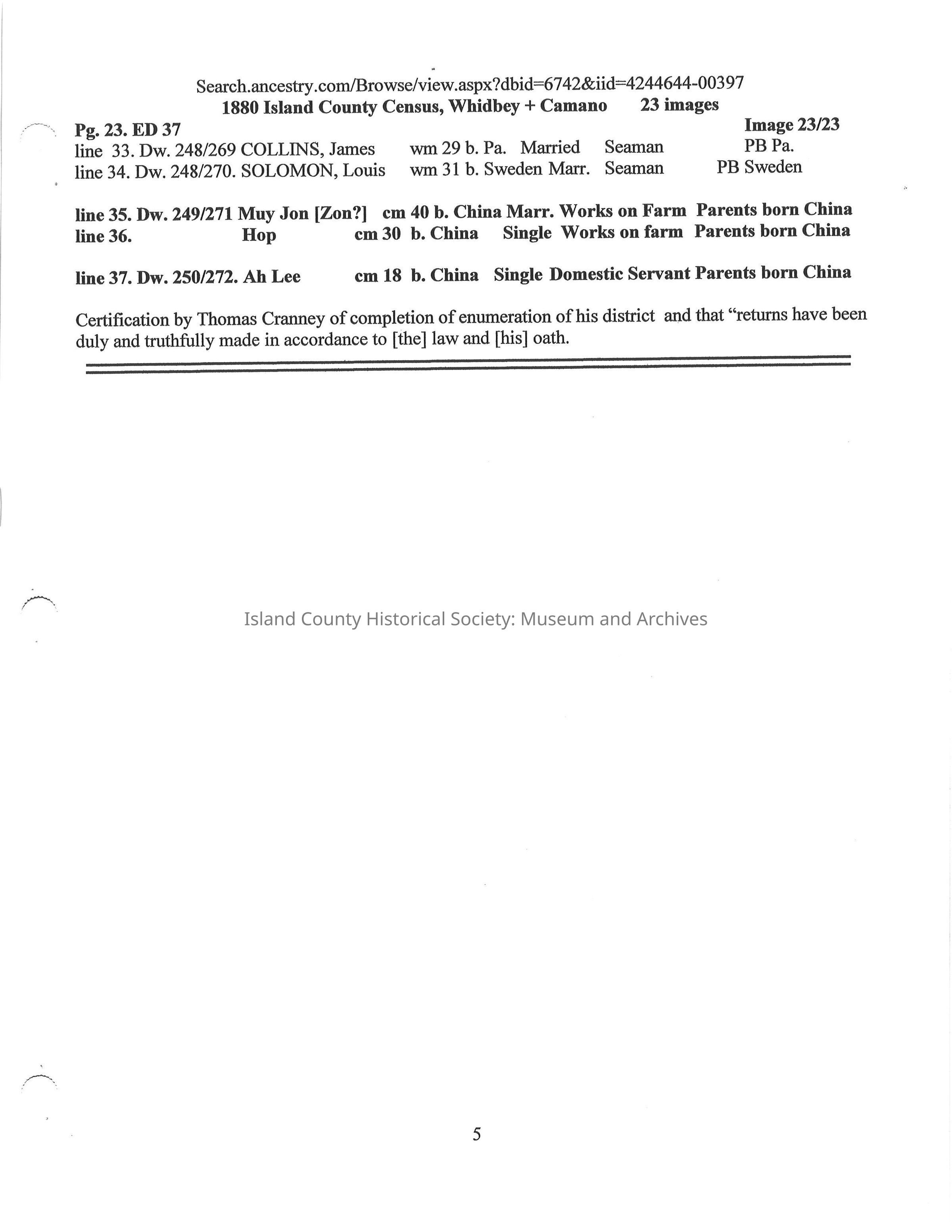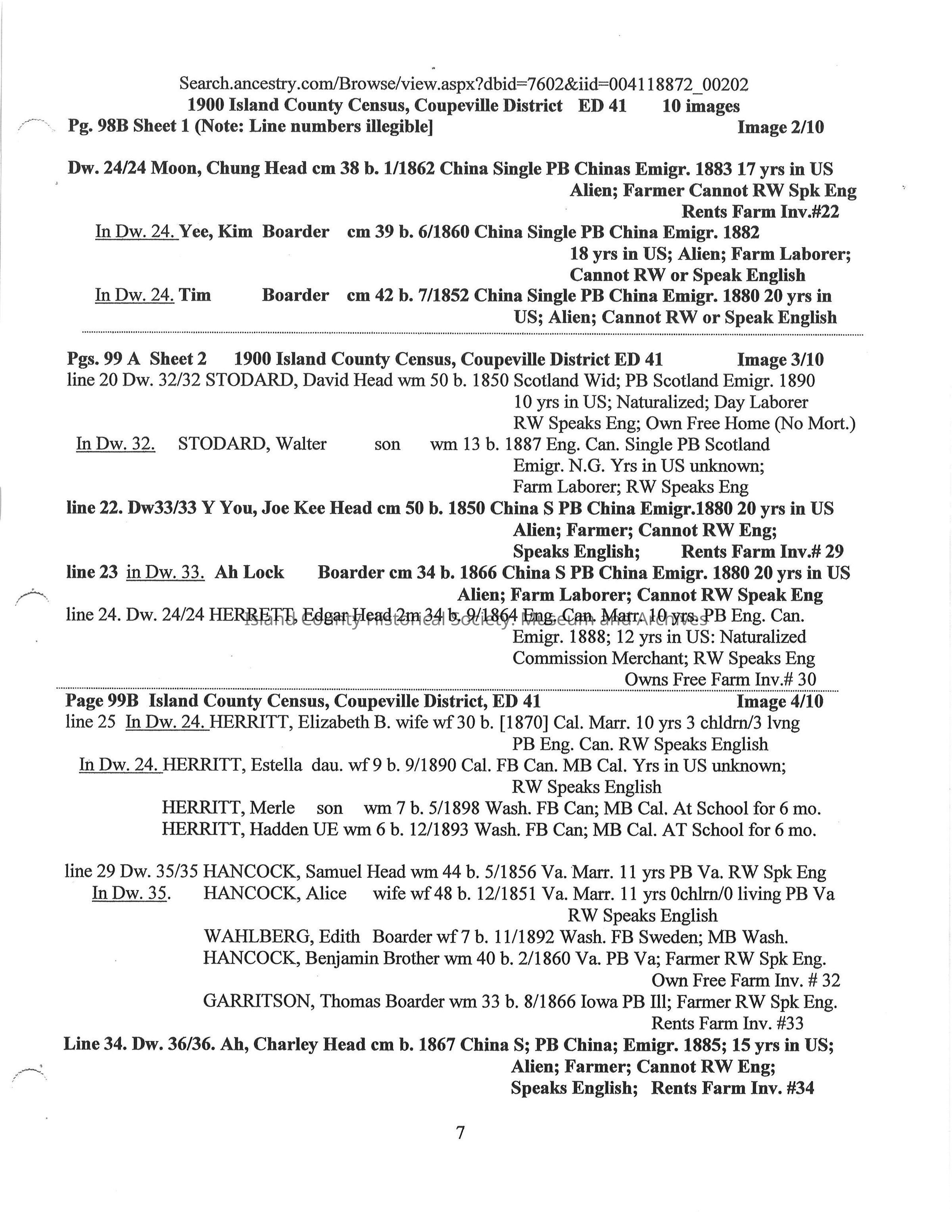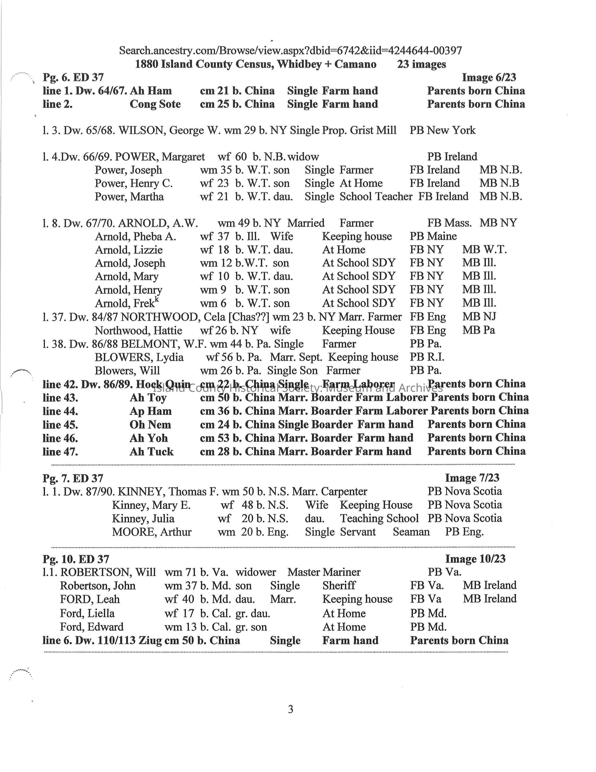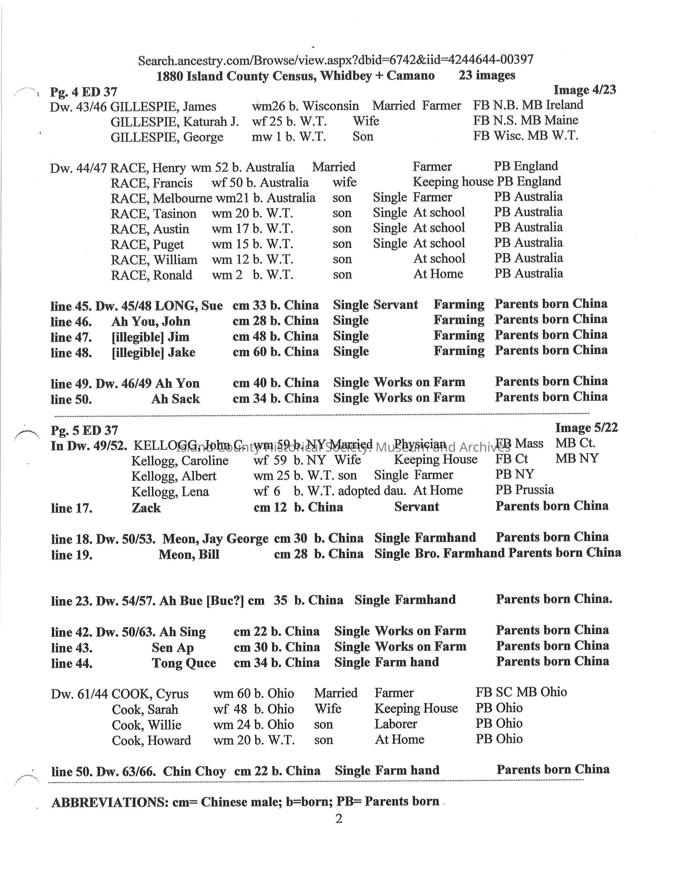 Compilation on the Chinese on Whidbey Island 1870 -1900 extracted from Whidbey Island Census Records