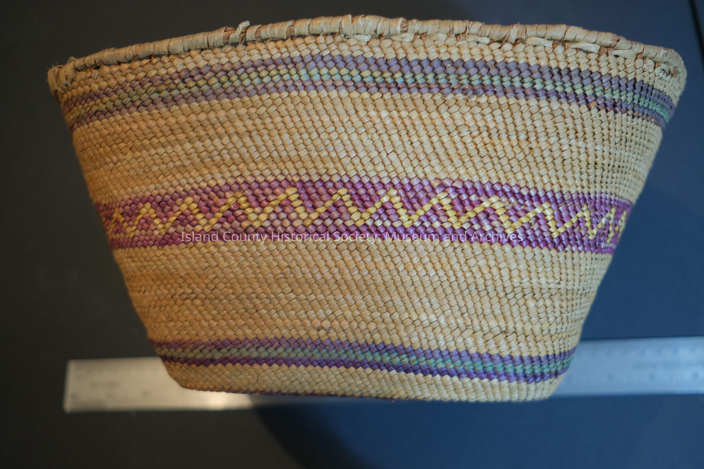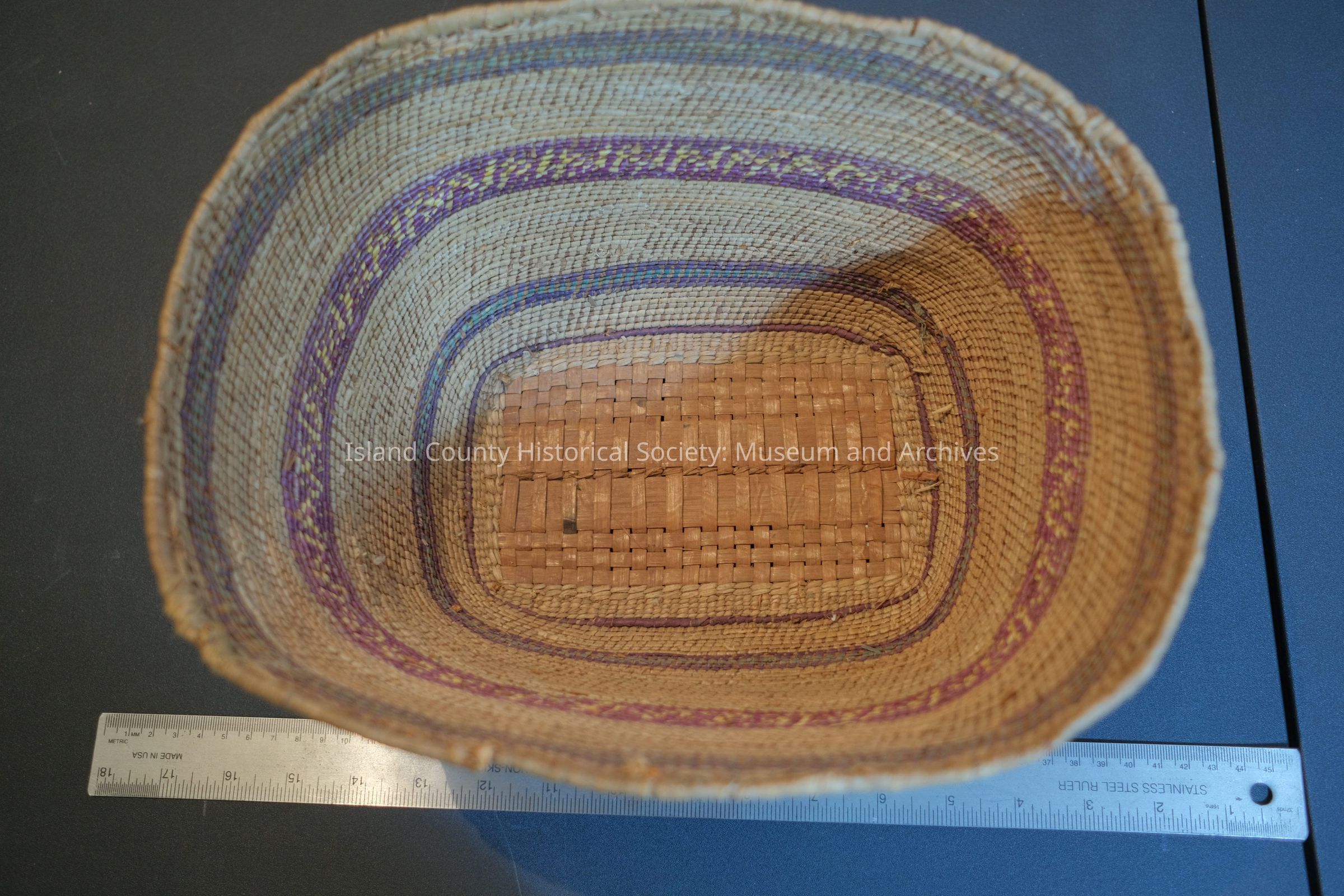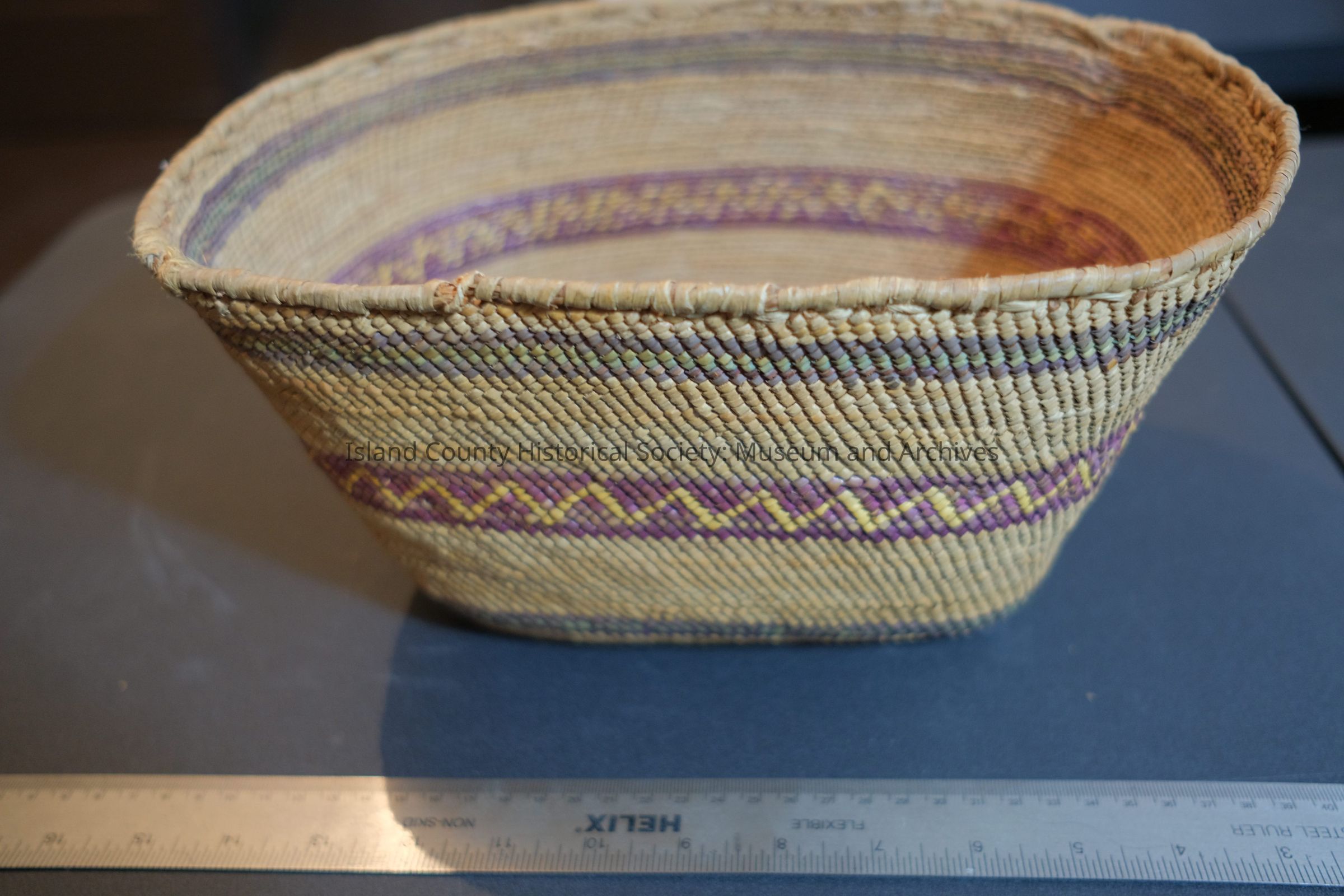 basket - Skagit; flared oblong basket; woven w/ red/yellow/green fibers in zigzagCollection