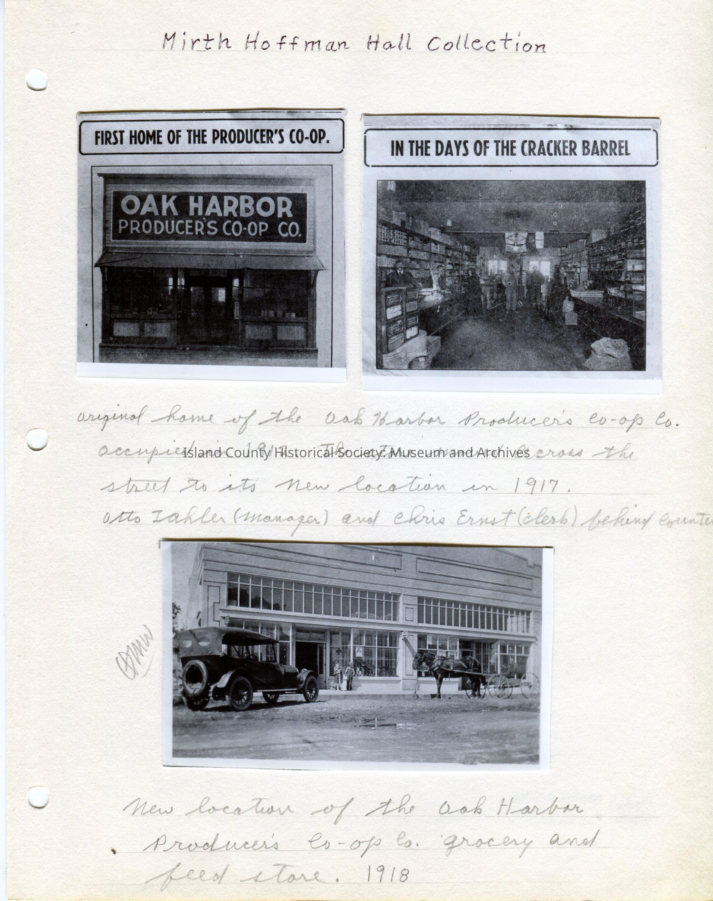 Top Left Photo - 3.25"W x 3.25"H - Photo of the store front of the original Oak Harbor Producer's Co-op Co.Photo looks like it was taken from a newspaper article. Above the store's name is the caption, FIRST HOME OF THE PRODUCER'S CO-OP.