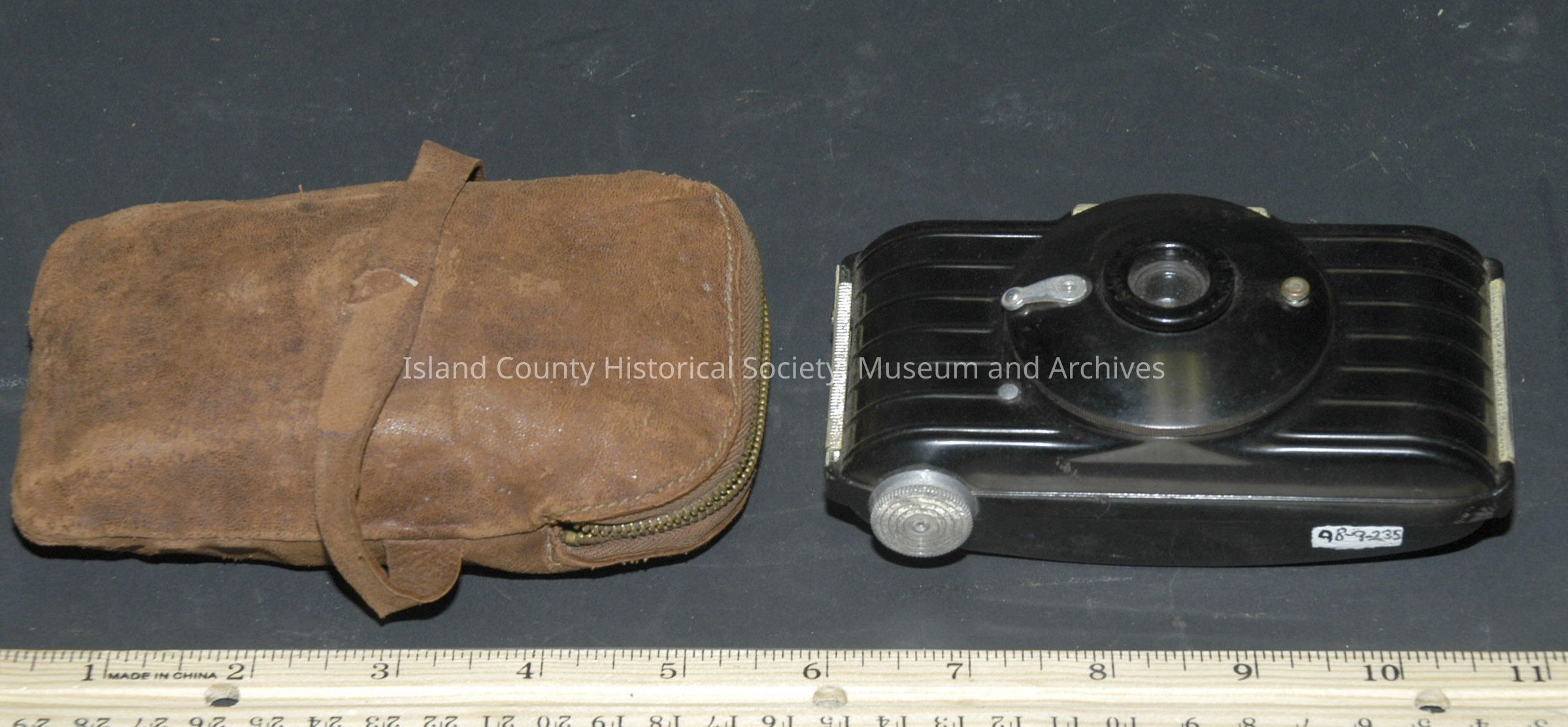 small camera with brown (leather?) bag Per the deed: Kodak "Bullett" camera - his own camera as a boy in the 1950s.