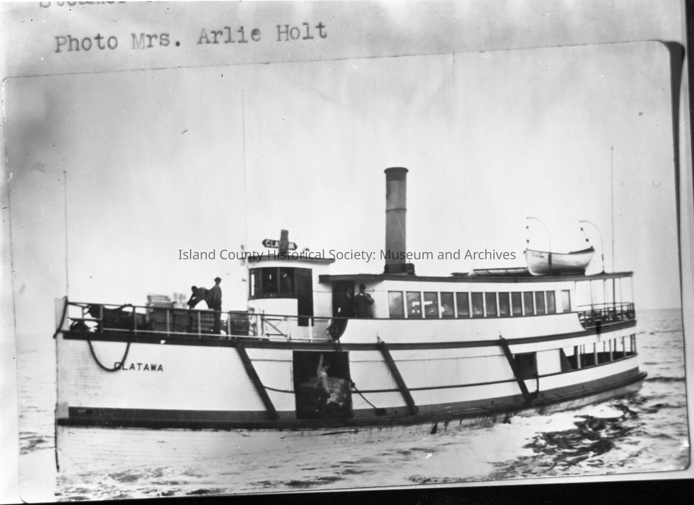 The Bow of the Clatawa is seen on the left edge of the frame and the stern towards the right edge. The steamer is angled with the bow in the foreground. Five men can be seen on board spread between the levels of the boat. A life boat is seen on the stern roof and the central steam smoke stack is nearly centered in the picture. Clatawa is written on the bow and atop of the wheel house.Relationships