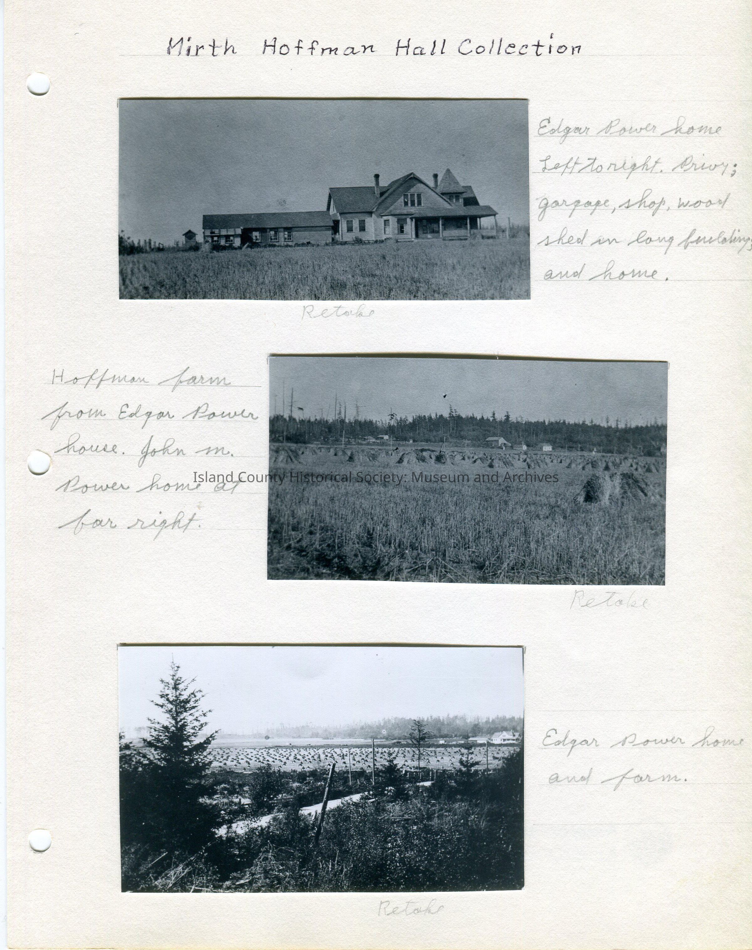 Middle Photo: 4.5"W x 2.5"H - Photo of the Hoffman farm from the Edgar Power house. Picture shows the fields with hay piles. No date. Written next to the picture: "Hoffman farm from Edgar Power house. John M. Power home at far right."