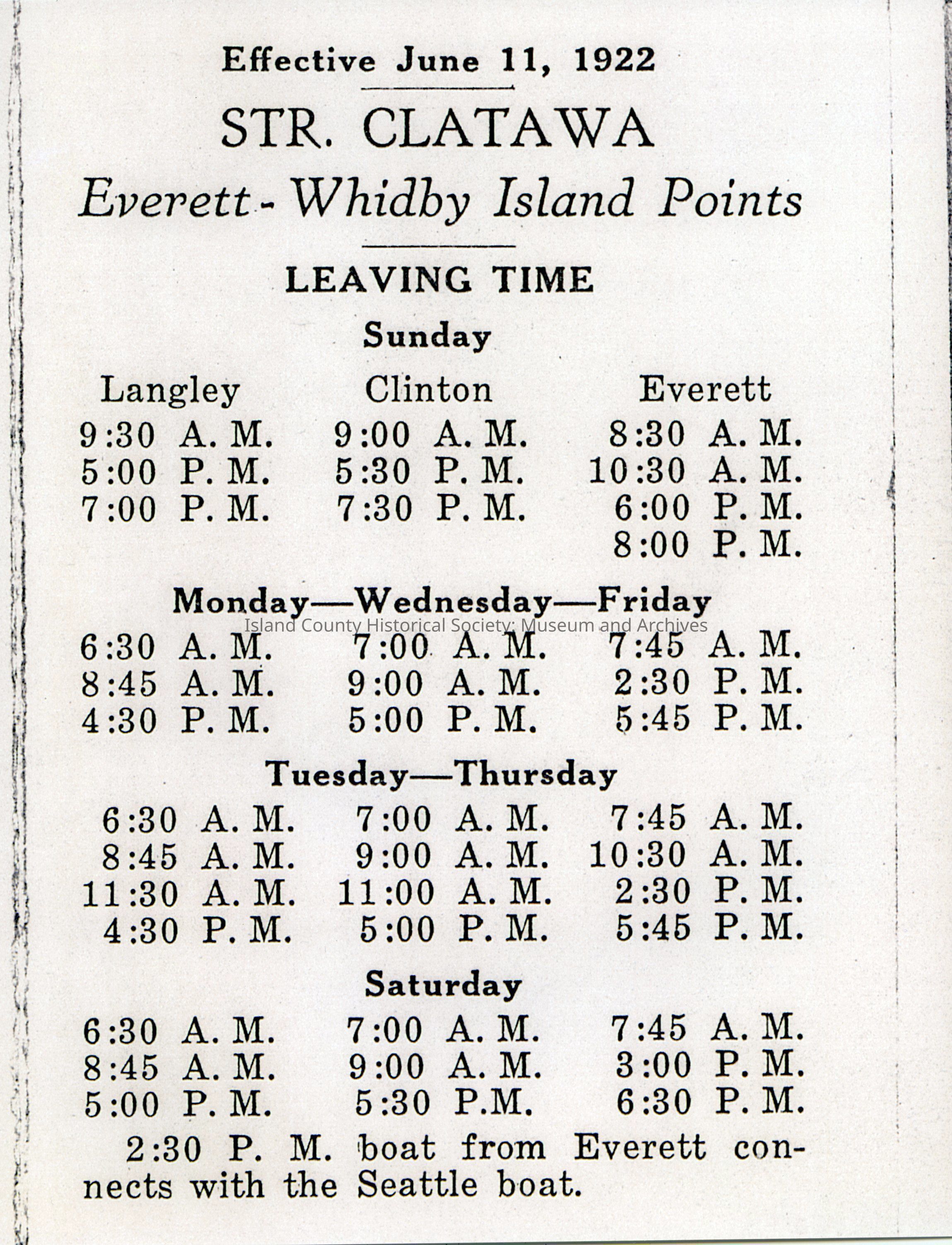 On back: "Clatawa schedule, 1922. Owned by Island Transportation Co. Rendezvous with Calista and Atlanta for freight and passengers to Everett. Credit: Island County Historical Society"Collection