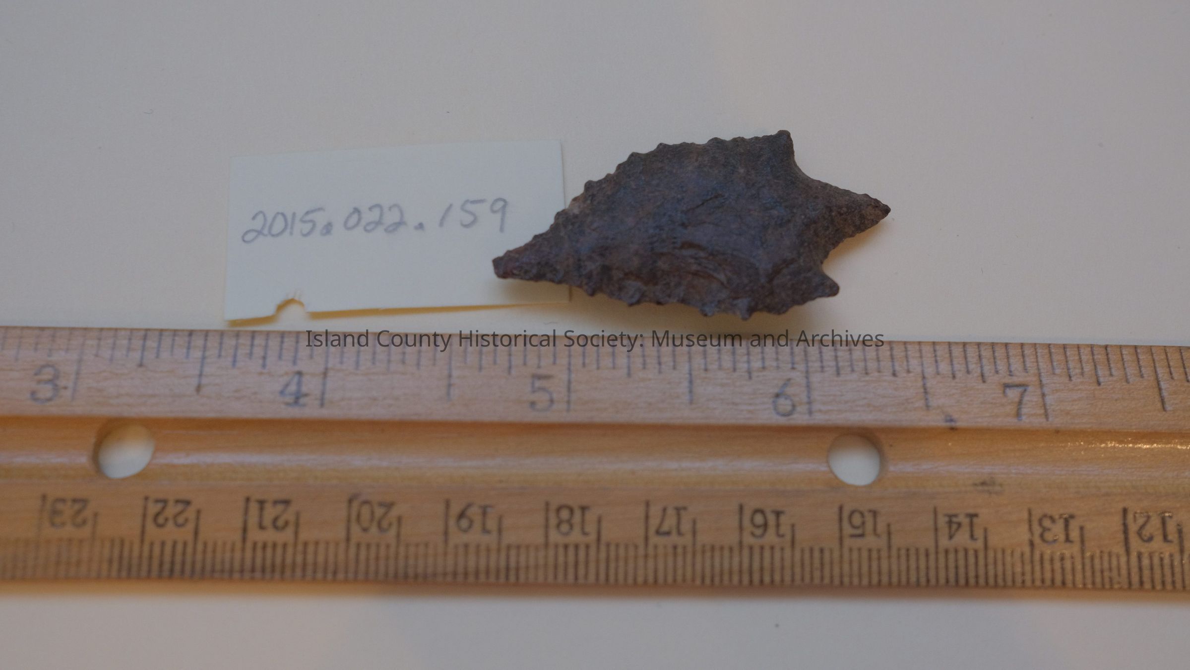 Projectile point. Triangular blade with serrated edges. Notches are slightly corned and straight. Stem is contracting to a point. Medium to dark brown in color.