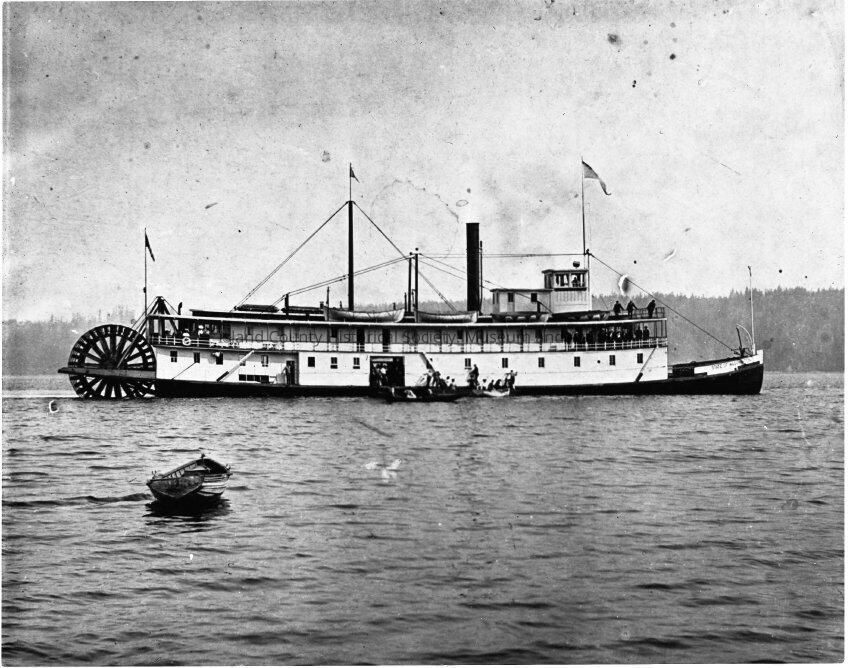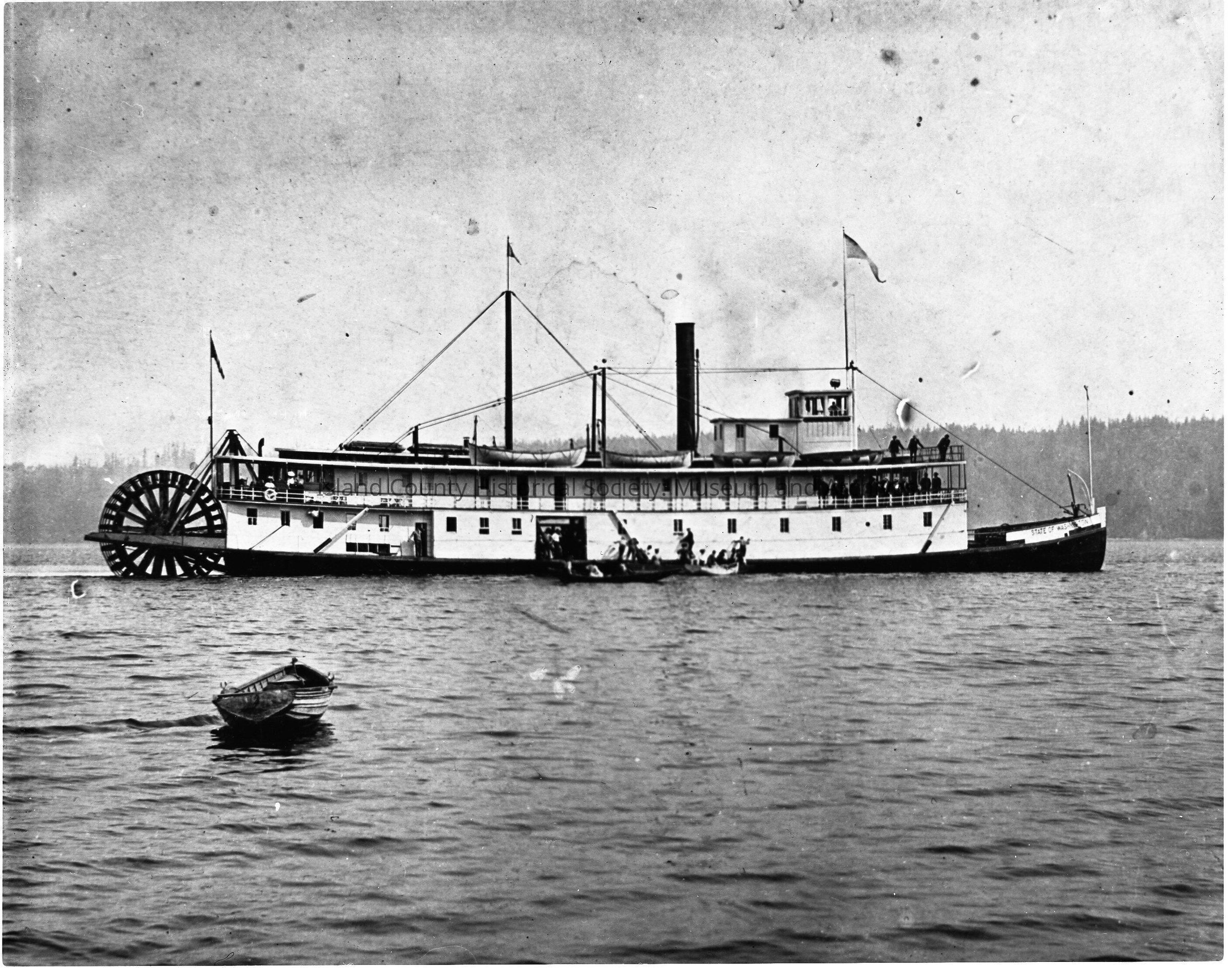 A steamer ferry, identified as the Telegraph, fills the frame with its stern water wheel on the left and bow on the right. It has on smoke stack and four visible life boats on the roof. Three men can be seen standing on the second story of the bow. Around the mid ship there appear small boats in the water loading or off loading people and goods. a small rowboat is seen in the left foreground of the picture.Made/Created