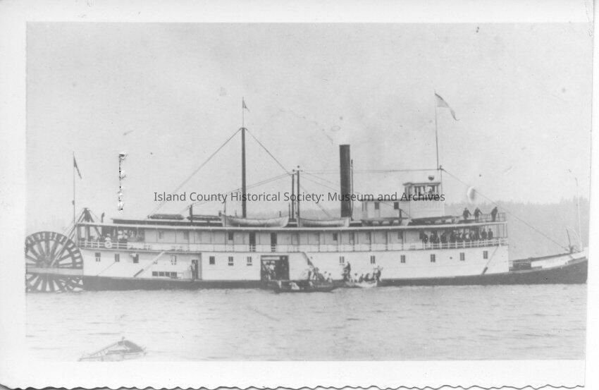 A steamer ferry, identified as the Telegraph, fills the frame with its stern water wheel on the left and bow on the right. It has on smoke stack and four visible life boats on the roof. Three men can be seen standing on the second story of the bow. Around the mid ship there appear small boats in the water loading or off loading people and goods. a small rowboat is seen in the left foreground of the picture.