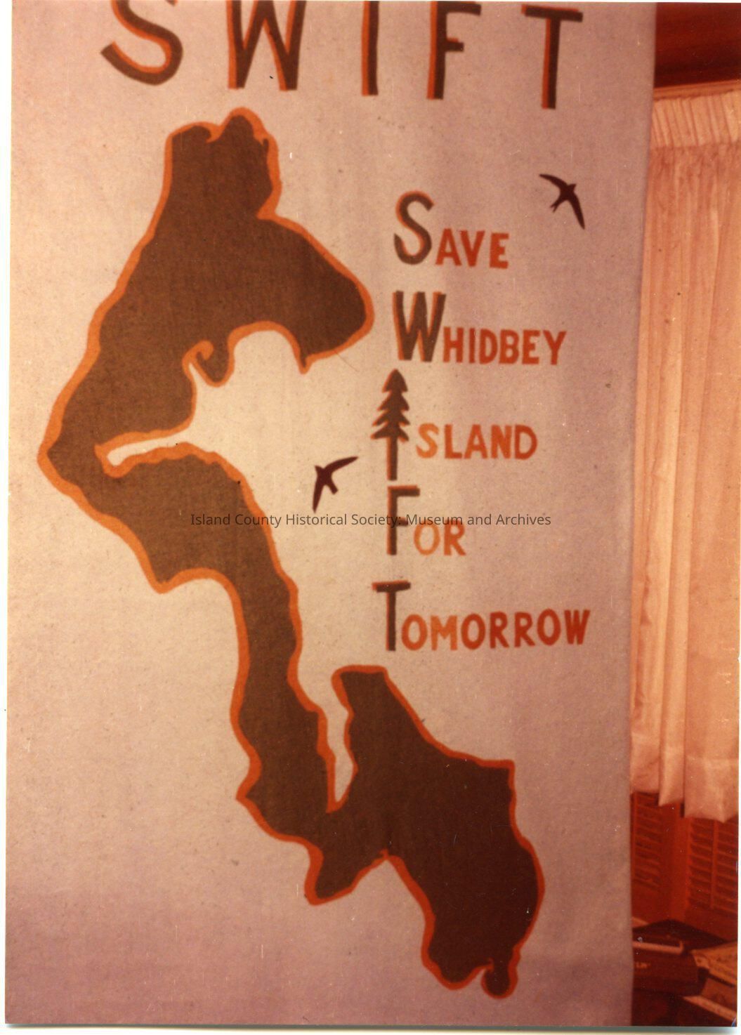 Photo of a banner,pale background and reddish/green letters and Whidbey Island with SWIFT at the top. Letters Save Whidbey Island For Tomorrow and two birds are on the right. On the back: SWIFT banner at SWIFT booth. Cousteau Involvement Day at Seattle Science Center. copy to Historical Society (banner). Oct. 29, 1977