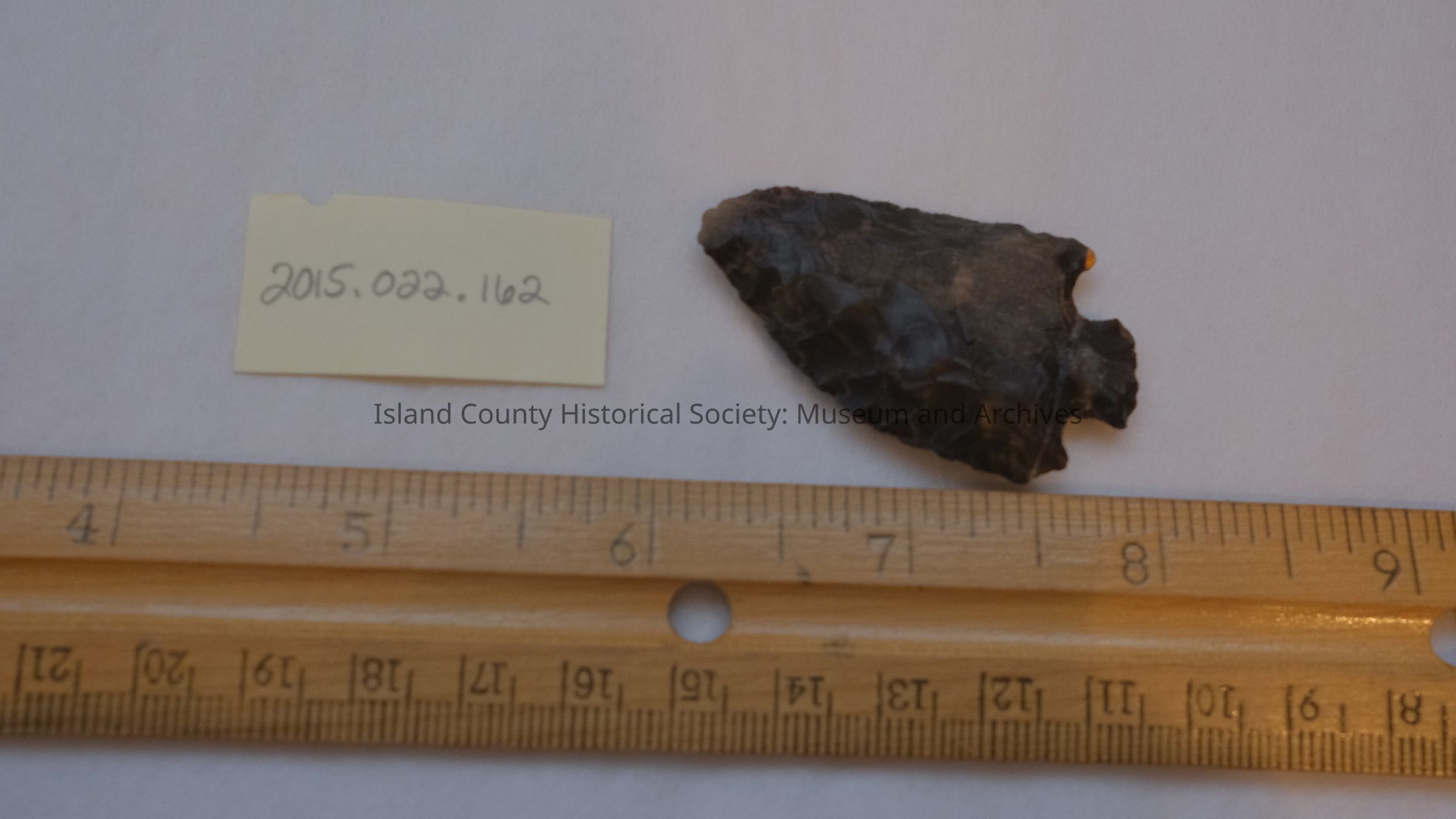 Projectile point. Triangular blade, corner notched expanding stem with convex base, inversely tapered barbs. Dark brown in color.Lexicon