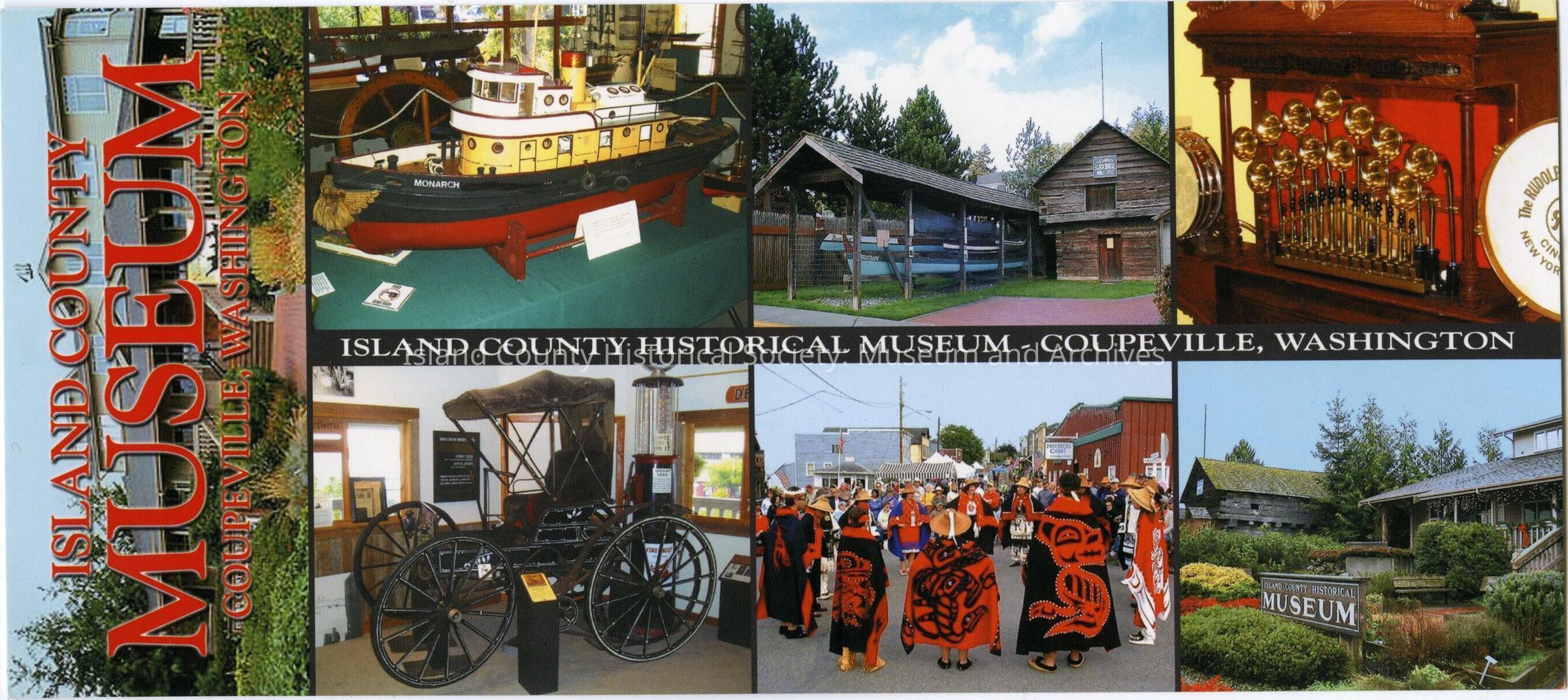 Postcard of the ICHS museum exhibits, blockhouse, boat shed. Also: the Holsman car snf hsd pump (in the corner). Native Americans with button blankets on the corner of Alexander Street and Front Street (facing east); they are standing in a circle. A tug boat, Monarch, model is on a table. An organ is on the top right.
