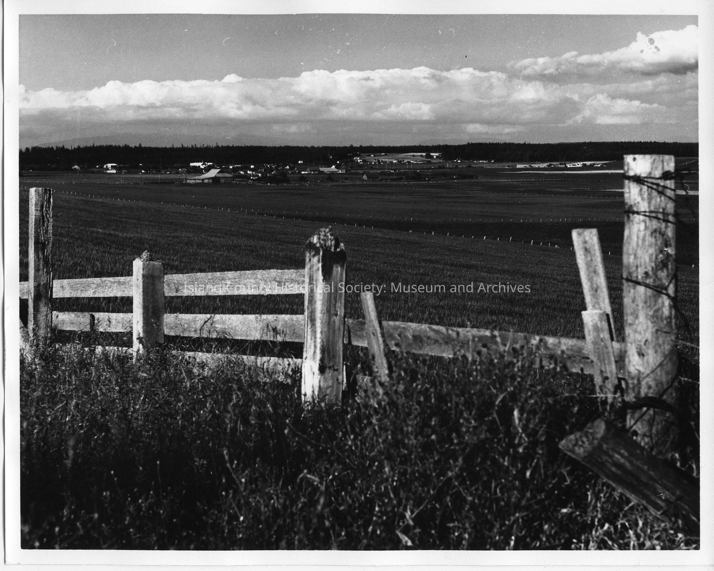 On the back of the photo it states: Site #9 Standing at the line of Jacob Ebey's claim and looking toward Coupeville over Ebey's prairie. Hand written note stating: Ebey's prairie looking northeast toward Coupeville.