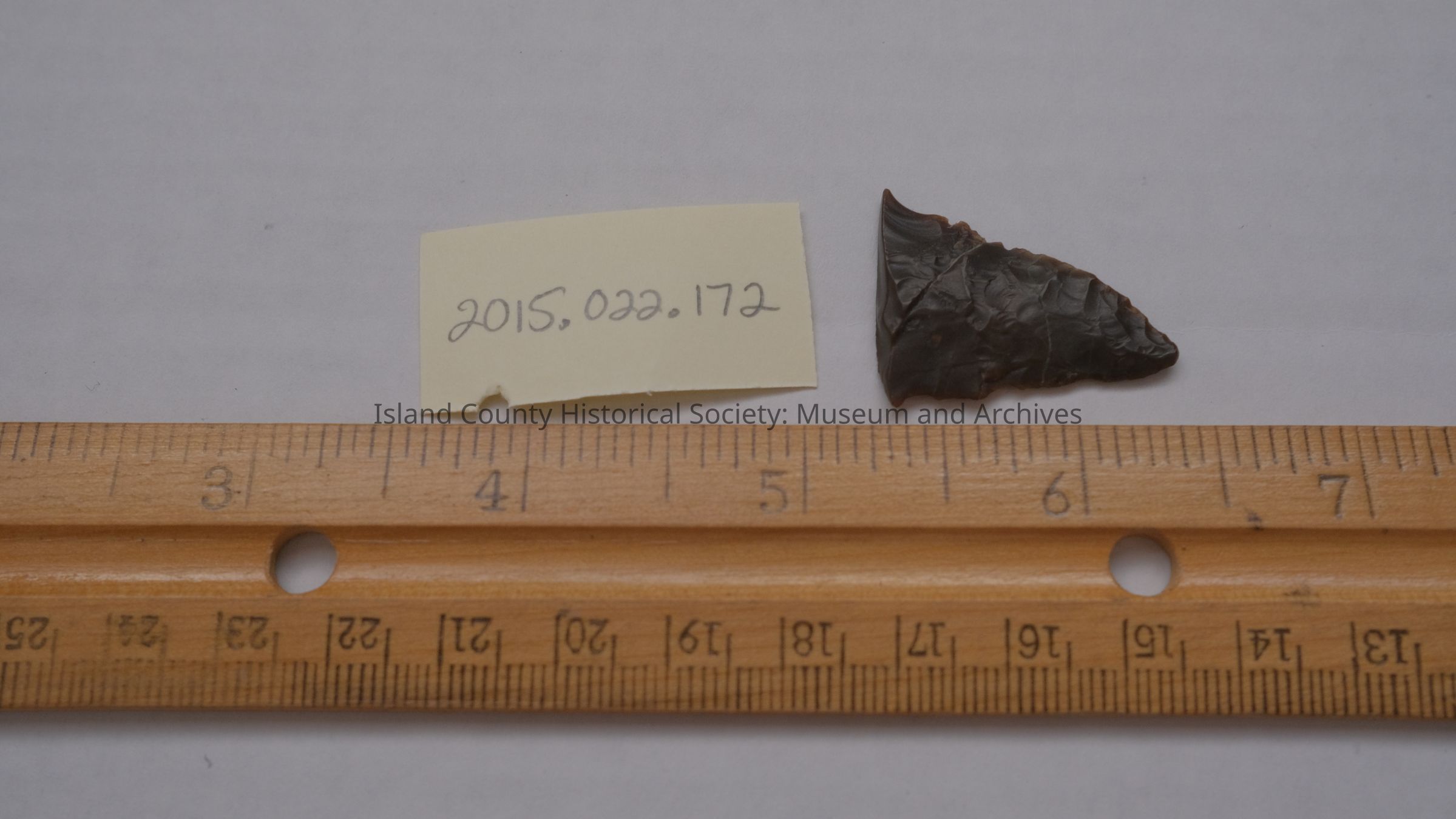 Projectile point blade. Triangular blade with stem/base broken off. Dark brown in color.