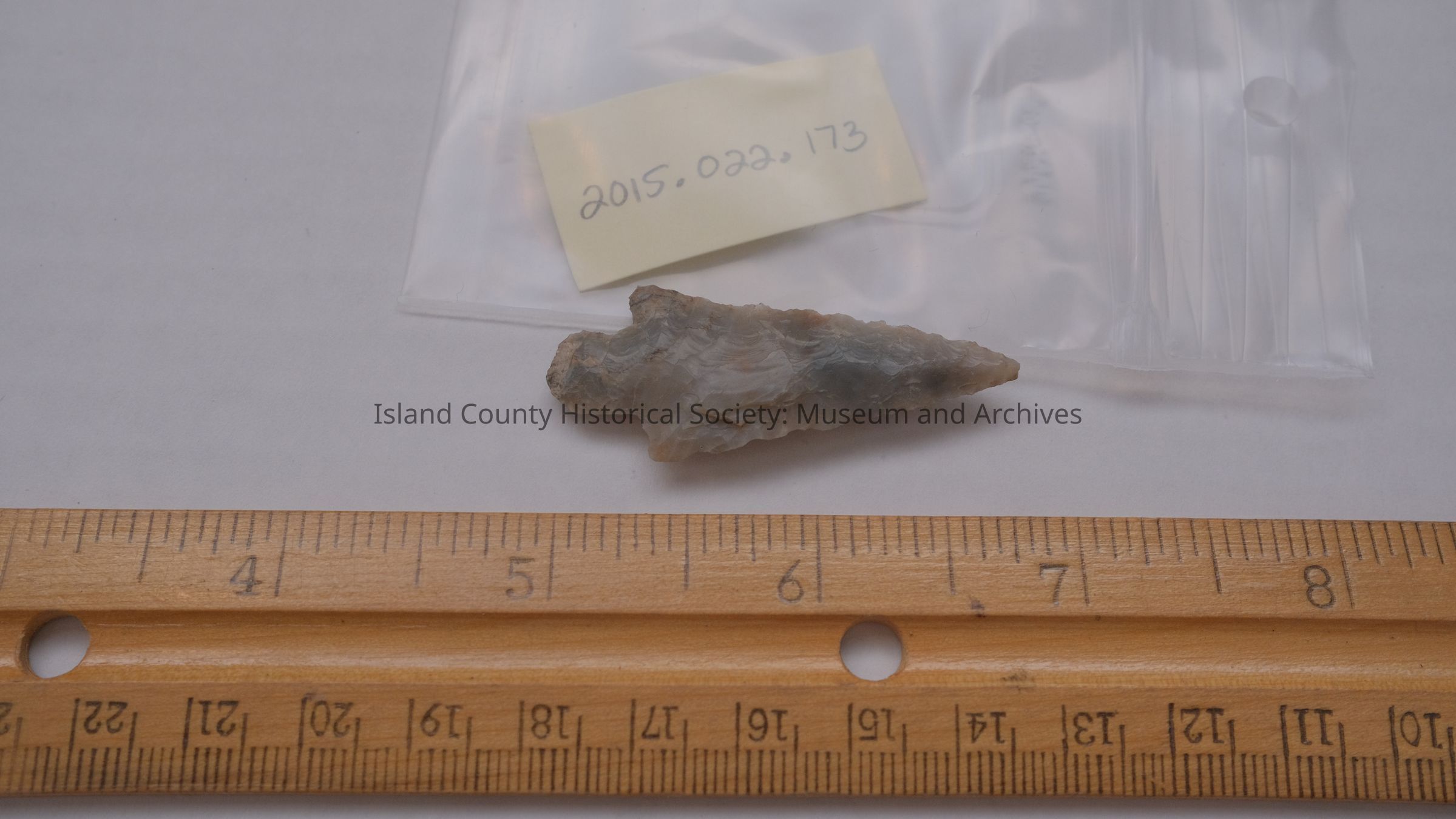 Projectile point. Triangular blade, straight stem with convex base, corner notched. Grey in color.