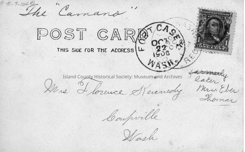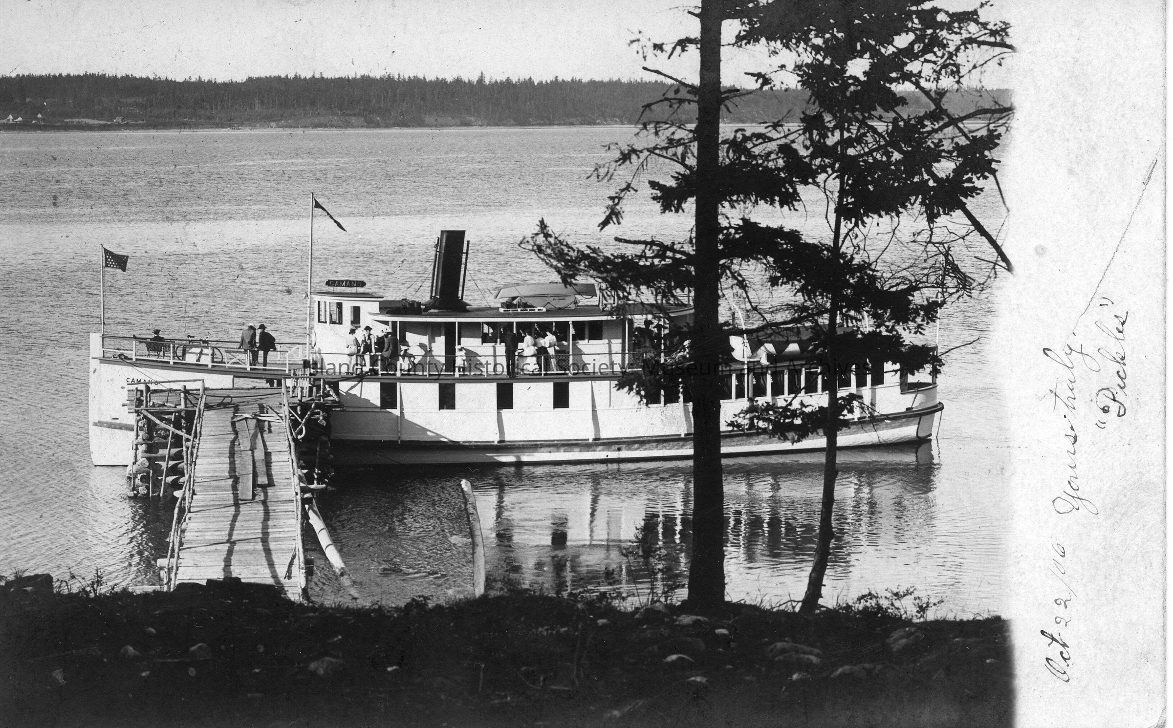 The Camano steamer at dock. There is an evergreen tree in the foreground blocking a clear view of the stern. Three men can be seen on the bow. There are two flags, one on the prow and the other raised above the wheelhouse. A number of men and women can be seen along the deck of the steamer. The back of the postcard reads, "The Camano" "Mrs. Florence Kennedy Coupeville Wash" "Later Mrs. Eber Thomas." Postmarked "Fort Casey Wash Oct 22 1906"