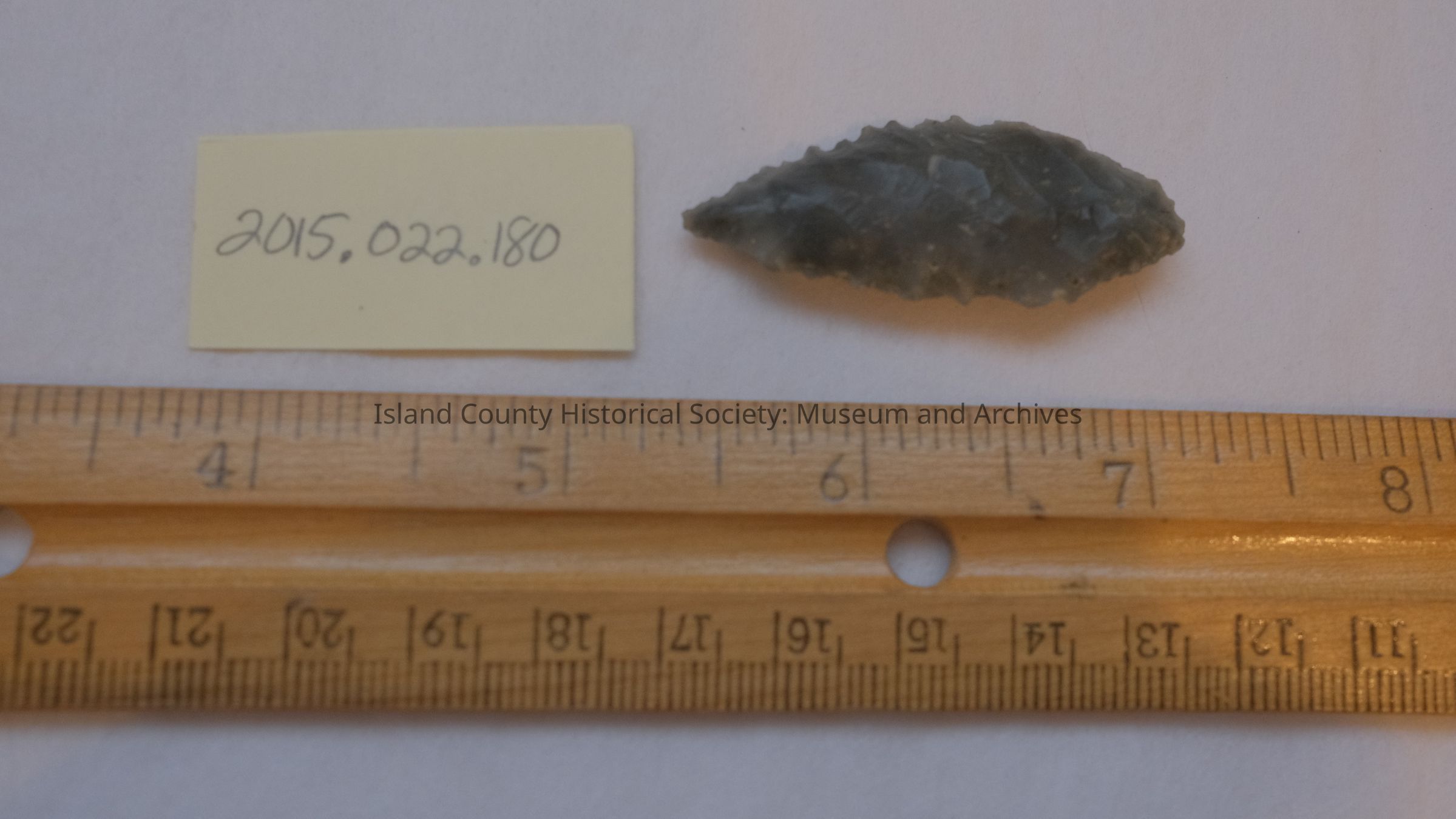 Projectile point. Triangular blade with serrated edges, contracting stem with convex base, no barbs. Medium to dark grey in color.Lexicon