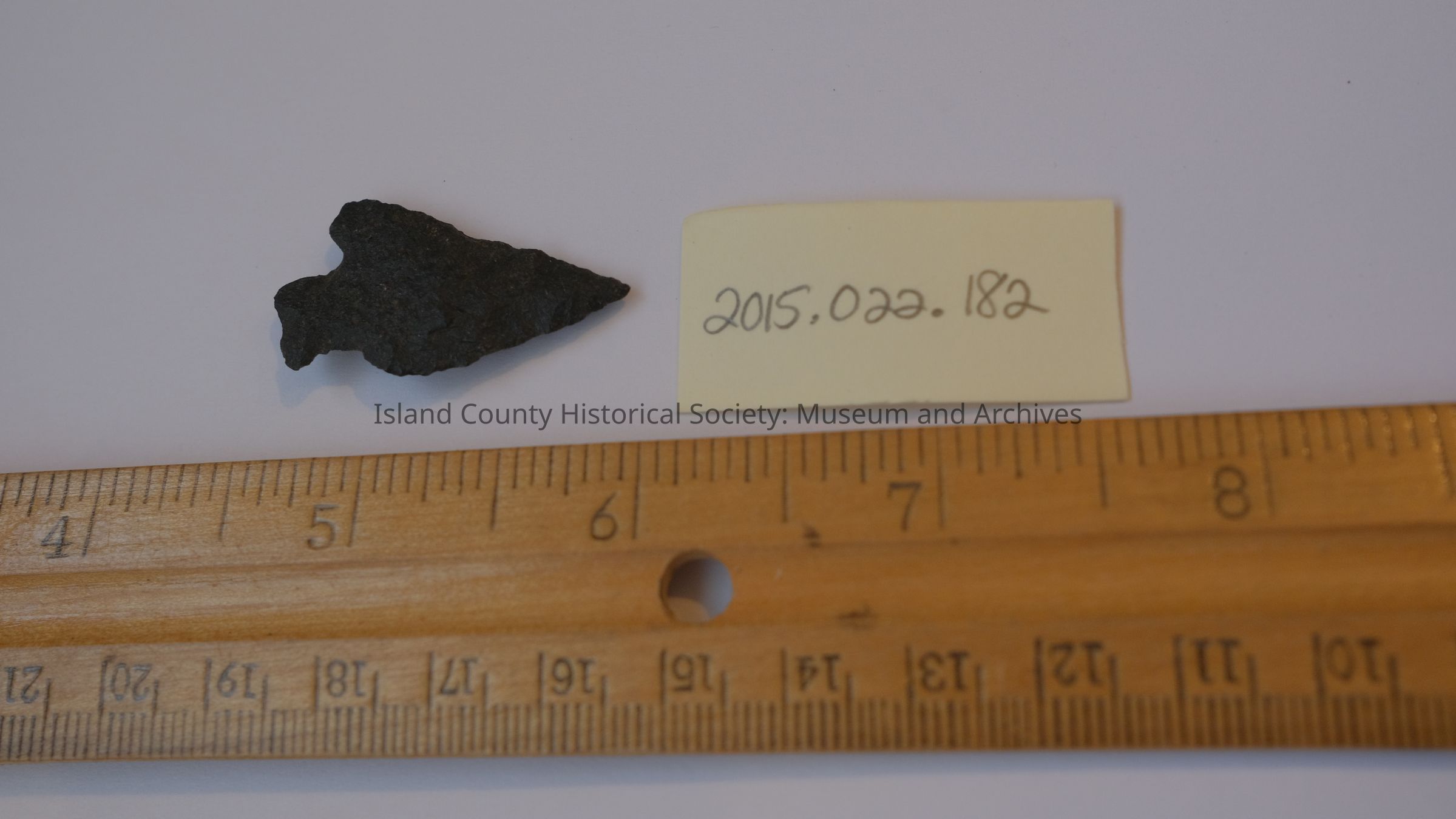 Basalt projectile point. Triangular blade with slightly expanding corner notched stem and mostly straight base. Barbes are unevenly sized asone is narrowly rounded and the other is inversely tapered.