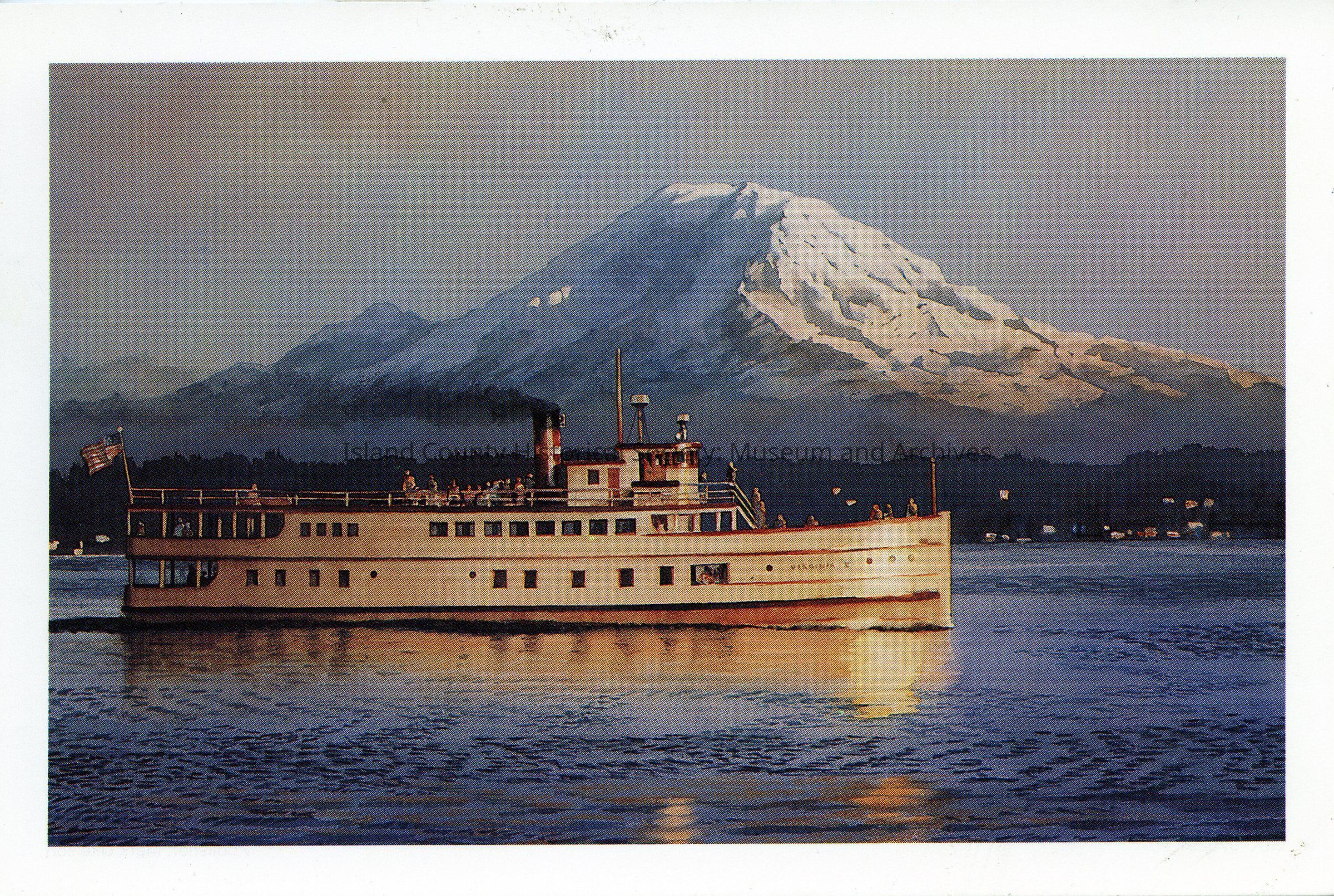 A painted scene with Mt. Rainier in background. The foreground has the "Virginia" steamship ferry sailing to the right. There are people on the mid deck and on the upper deck. The water is relatively calm. A few buildings dot the shore in the background. The light hits the bow of the boat.Made/Created