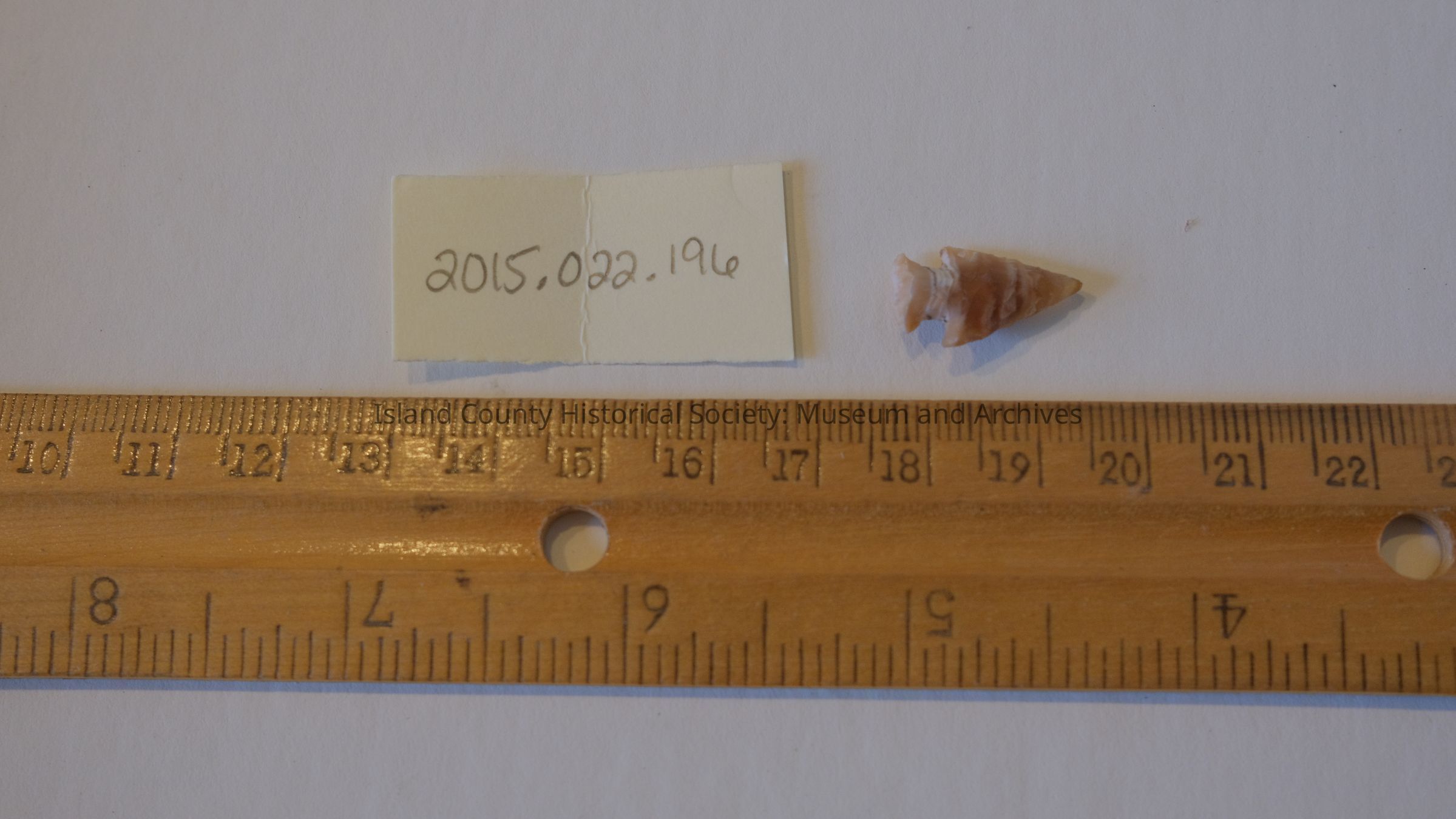 Projectile point. Triangular shape blade, corner notched stem with flat base. Striped in color with browns and whites.