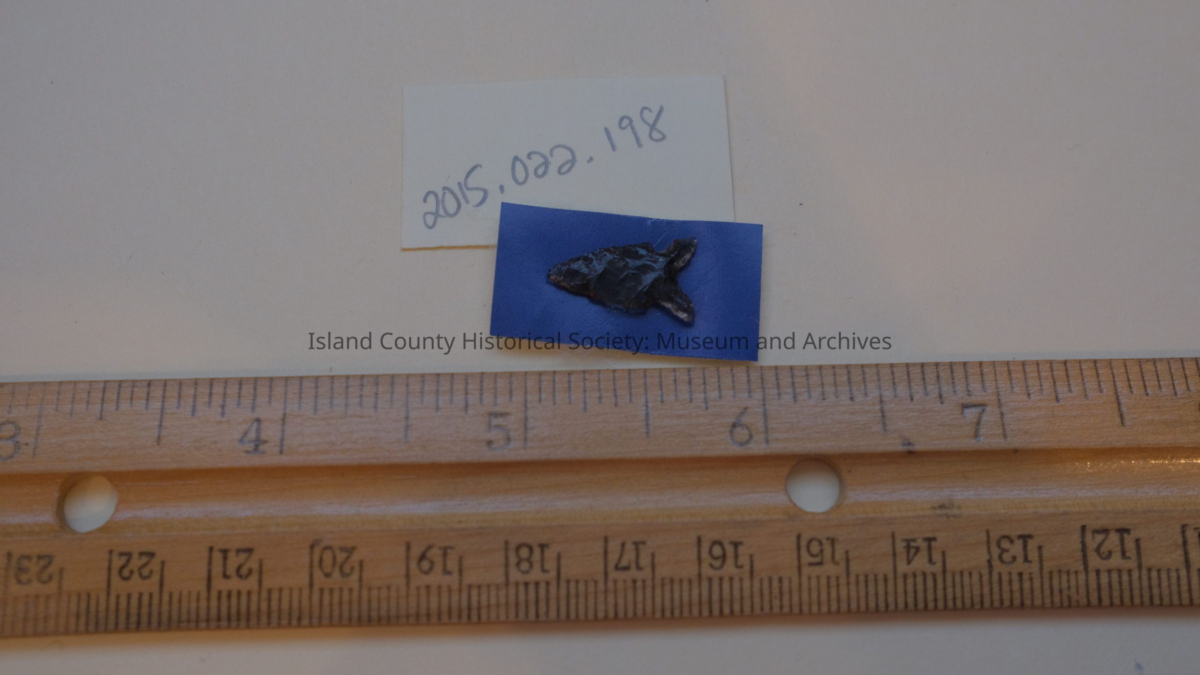 Projectile point - glued to blue paper. Triangular blade, side notched stem with basal notched base. Made from obsidian or other glass, translucent black in color.Lexicon