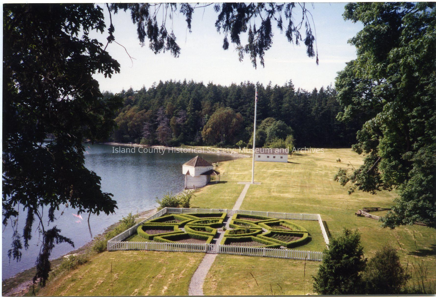 Photo of a small blockhouse on the beach with an elaborate knot garden in the foreground, parade ground beyond, flagpole, and another building. The garden is surrounded by a white picket fence. A gravel path leads up to, through and beyond the garden to the flagpole. A bench and split rail fence are on the right. A note: English Camp, San Juan Island.