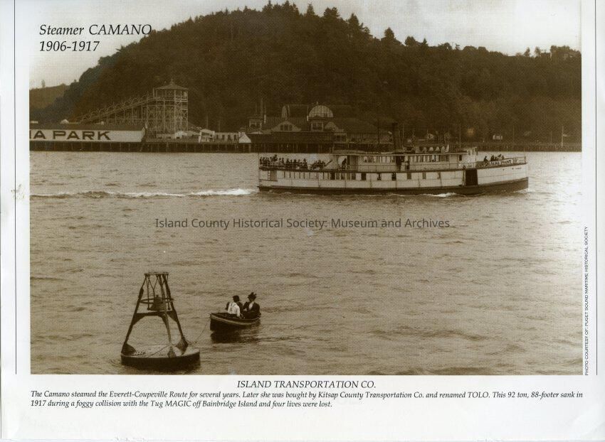 The photograph was from a calender and the caption read:, "The Camano steamed the Everett-Coupeville Route for several years. Later she was bought by Kitsap County Transportaion Co. and renamed TOLO. This 92 ton, 88-footer sank in 1917 during a foggy collison with the tug MAGIC off Bainbridge Island and four lives were lost."