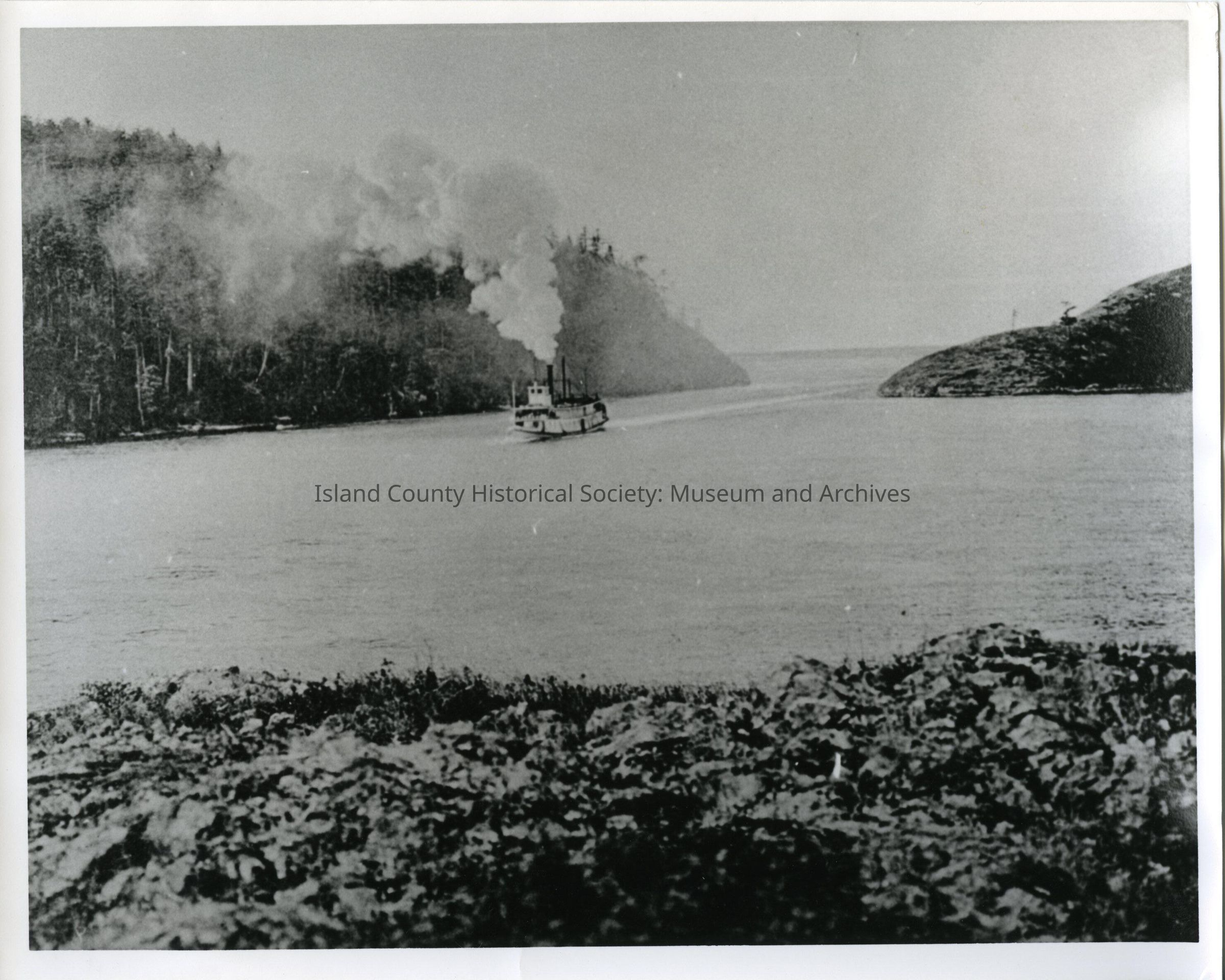 Black and white photo and theres a description on the back. " Fairhaven at deception pass, pre 1920's" "Hank Henny 2915 Birchwood, Bellingham WA, 98225". There's steam coming out of the boat and there's land near by.