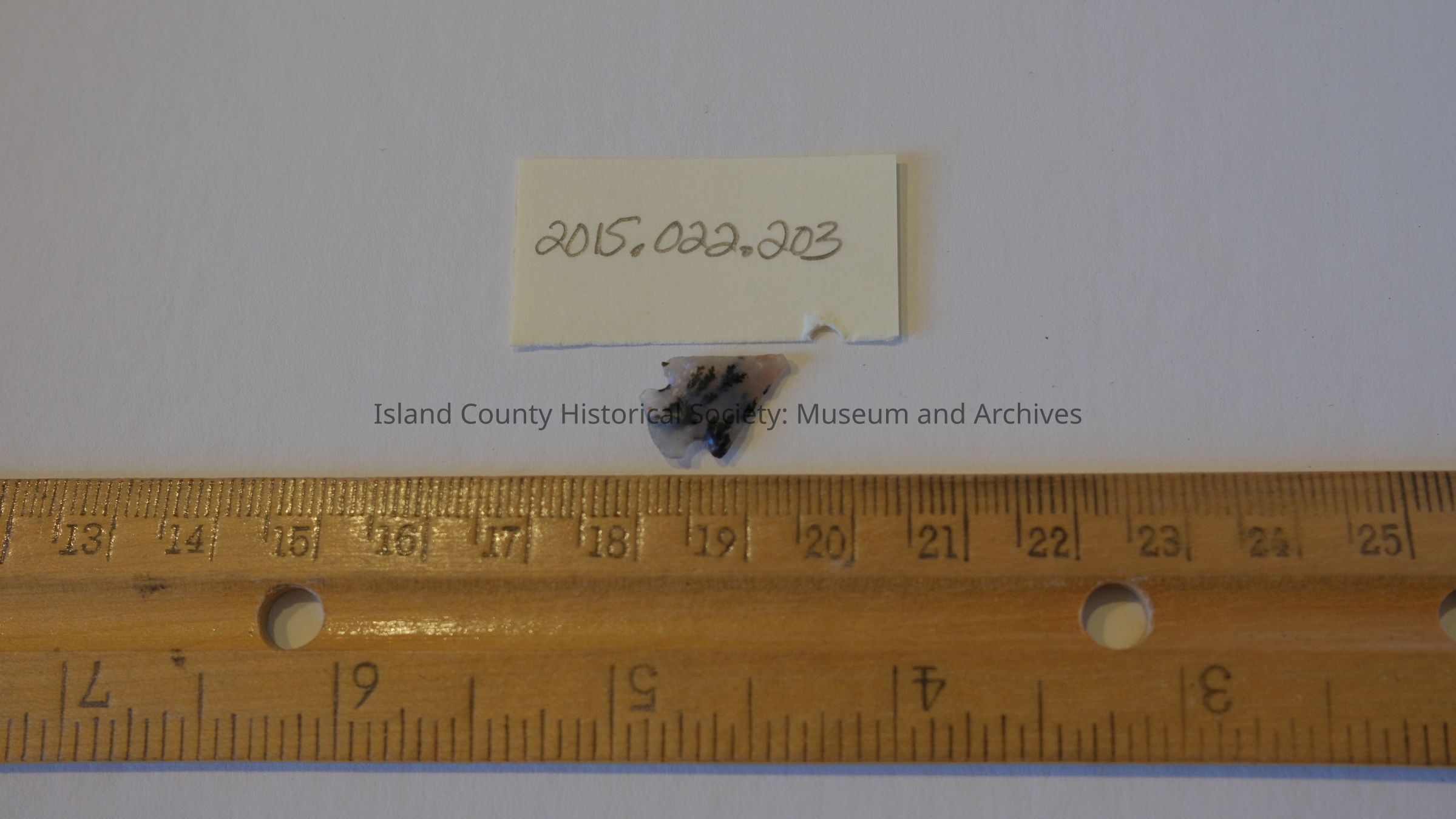 Projectile point. Triangular blade, corner notched expanding stem with flat base, horiztontal barbs. Cream colored with specks of black.Lexicon