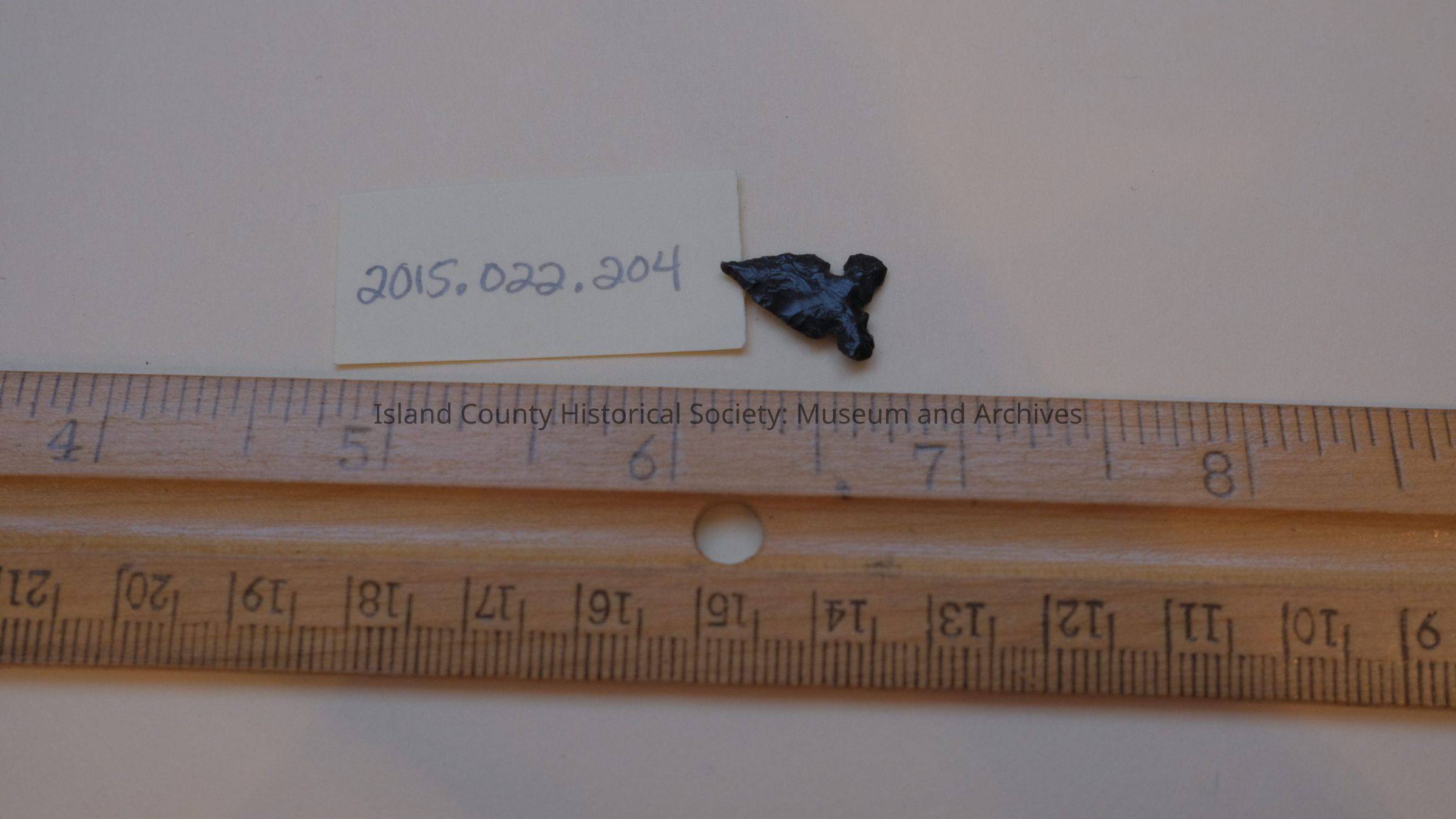 Projectile point. Triangular blade, side notched expanding stem with concave base. Obsidian