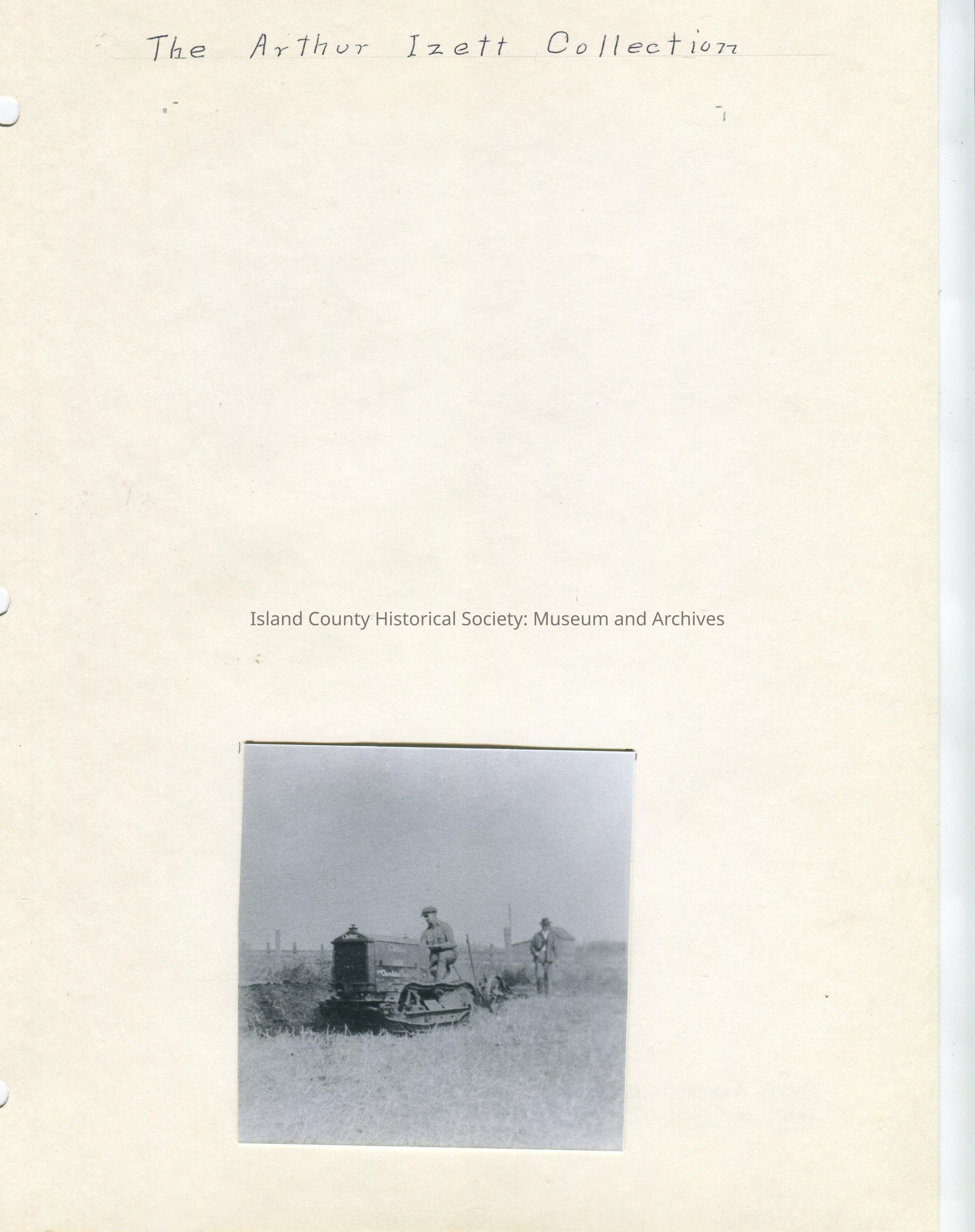 Bottom Photo - Photo of a man riding a tractor in a field. There is a second man walking behind the man on the tractor. No names and no date.Lexicon