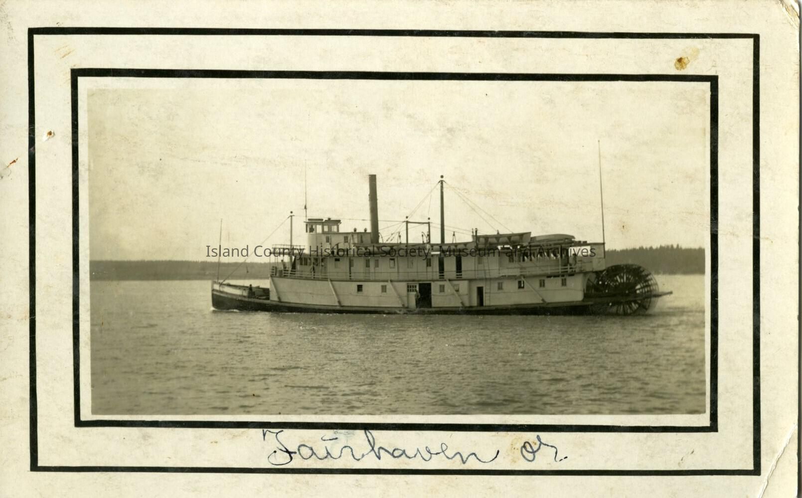 This is a black and white photo post card. This front of the photo is titled "Fairhaven", a stern wheeler passing through the water with a shore in the distance.