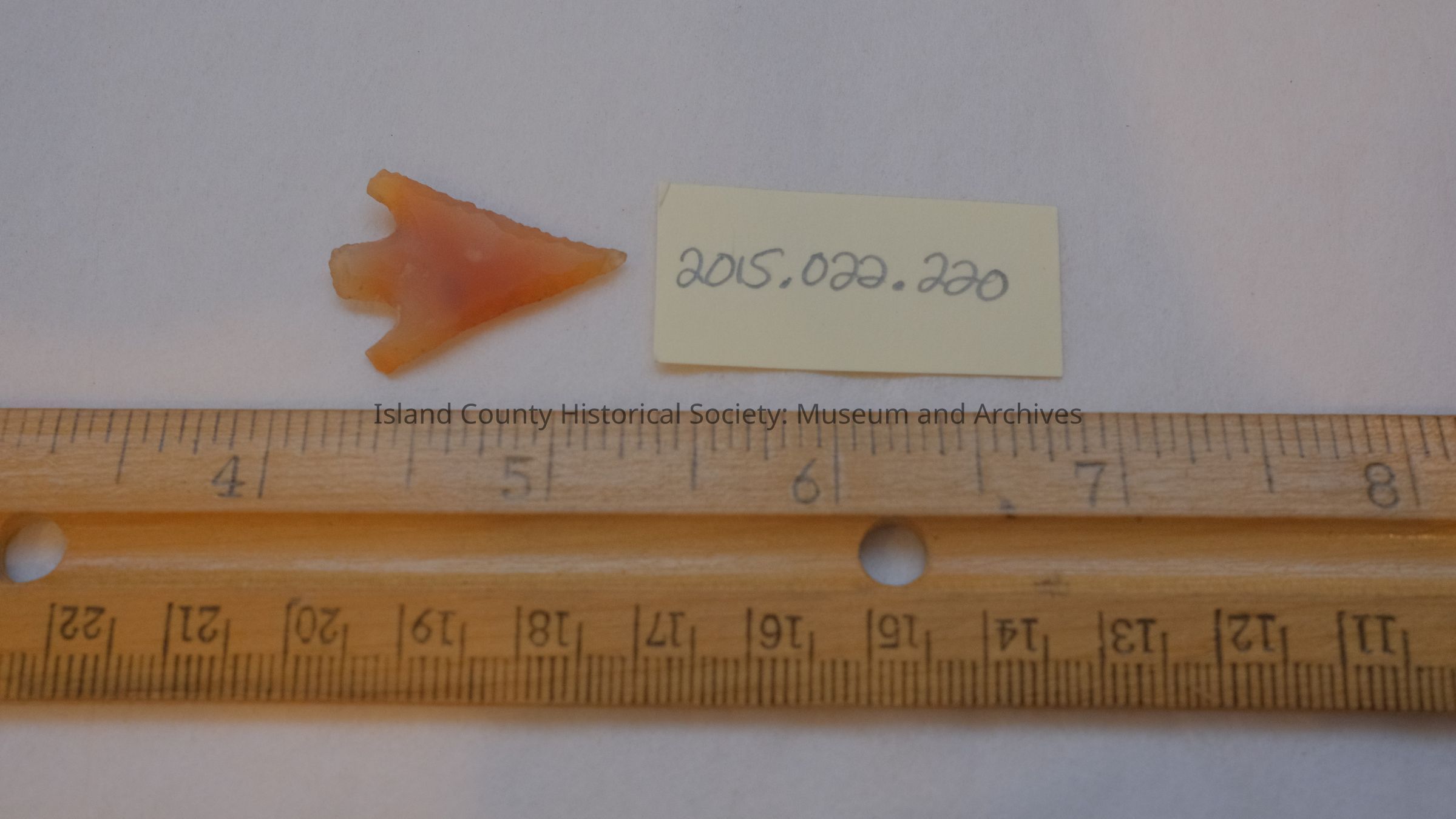 Projectile point. Triangular blade, corner notched contracting stem with straight base, inversely tapered barbs. Orange in color.Lexicon