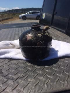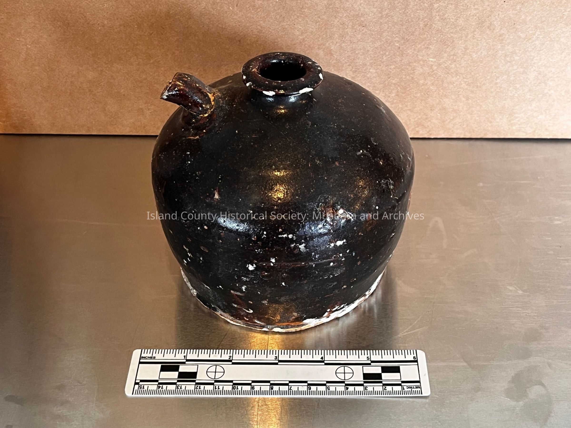 Chinese soy jar or jug. Rim of jug is chipped and spout is broken off but was glued back on at some point prior to donating . Brown in color. Found off Keystone Spit - off "Little Chicago".
