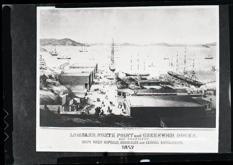 Negative of ships at a dockyard and still in the harbor area. Caption: Lombard North Point and Greenwich Docks, San Francisco. 1857 From the folder: Washington State History -Off-Island Photos, Dorothy Neil Collection