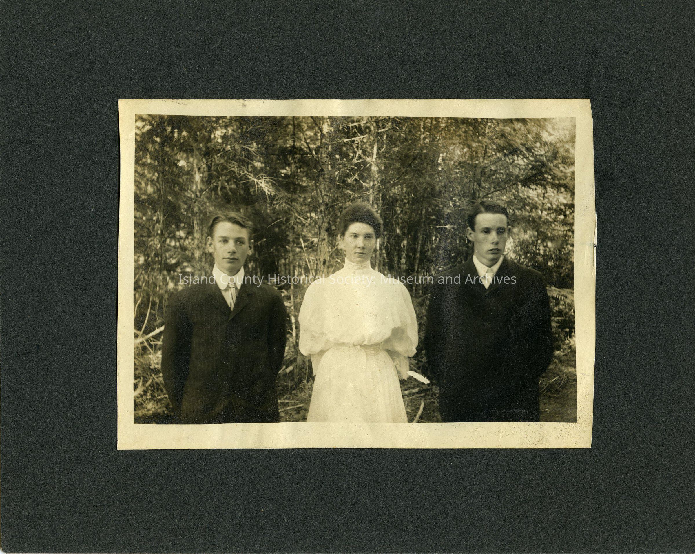 Three young people standing in front of trees, two boys in suits and ties flanking a girl in a white high-collared dress. On back: CHS (Coupeville High School) graduating class 1905. Lemuel Wanamaker, Belle Comstock, Eugene Ammon Hancock. At bottom: Mrs. Carl Dean, CoupevilleLexicon