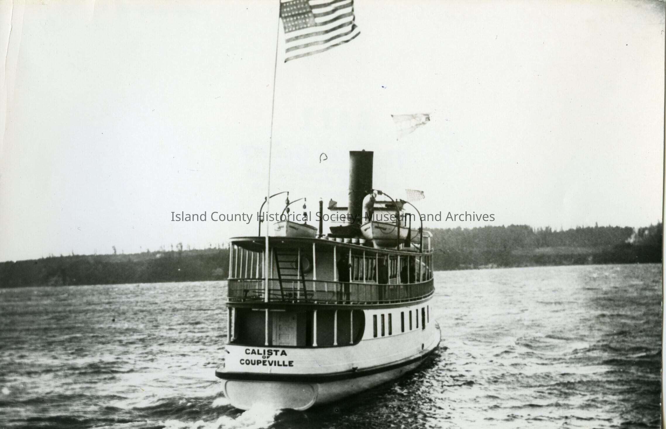 The photo is black and white. On the stern, the boat'same is "Calista of Coupeville". On the back, the photo is stamped with " The Little Gallery 1112 West Pioneer Way, Oak Harbor, Washington". The left top of the back of the picture says "Captain H.B Lovejoy's Calista". The body of water may be Penn Cove.Lexicon