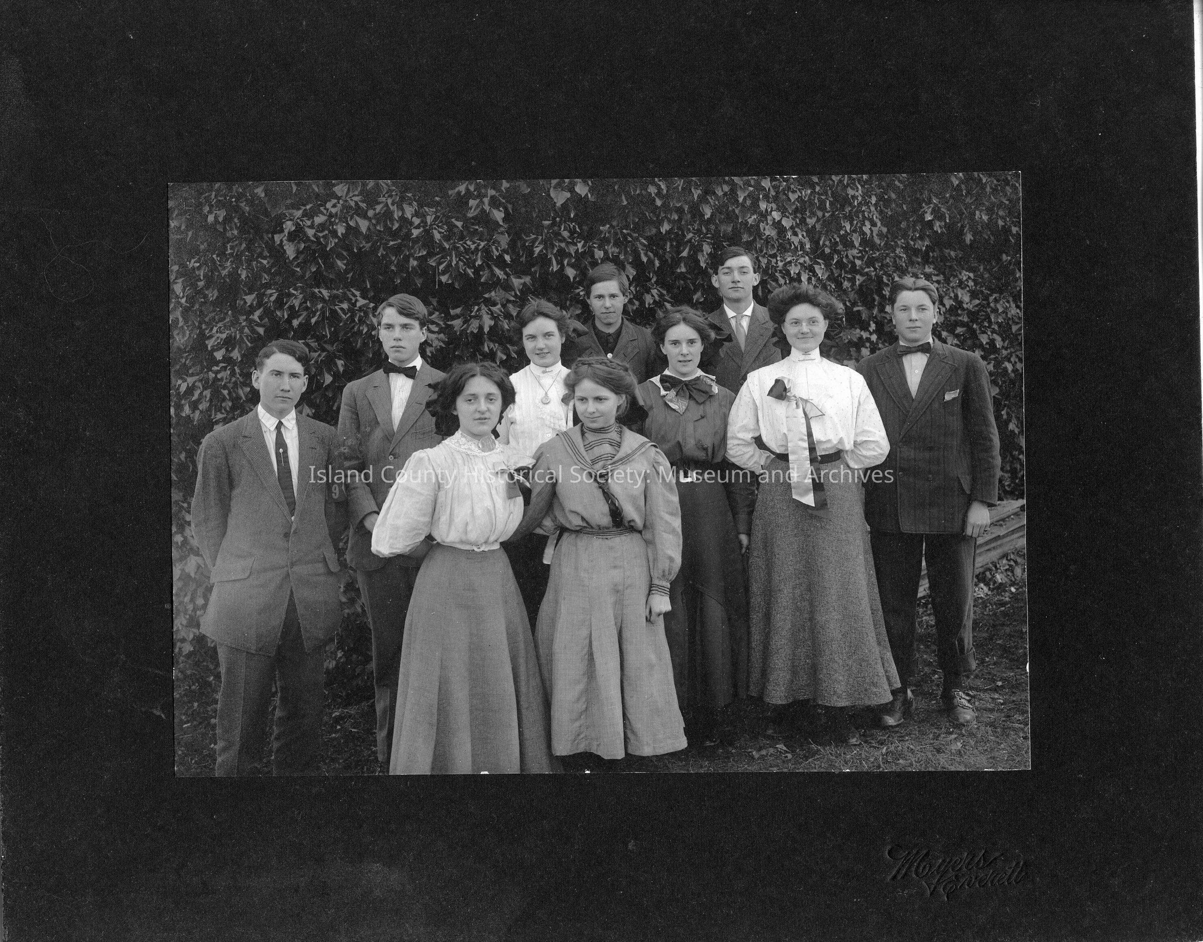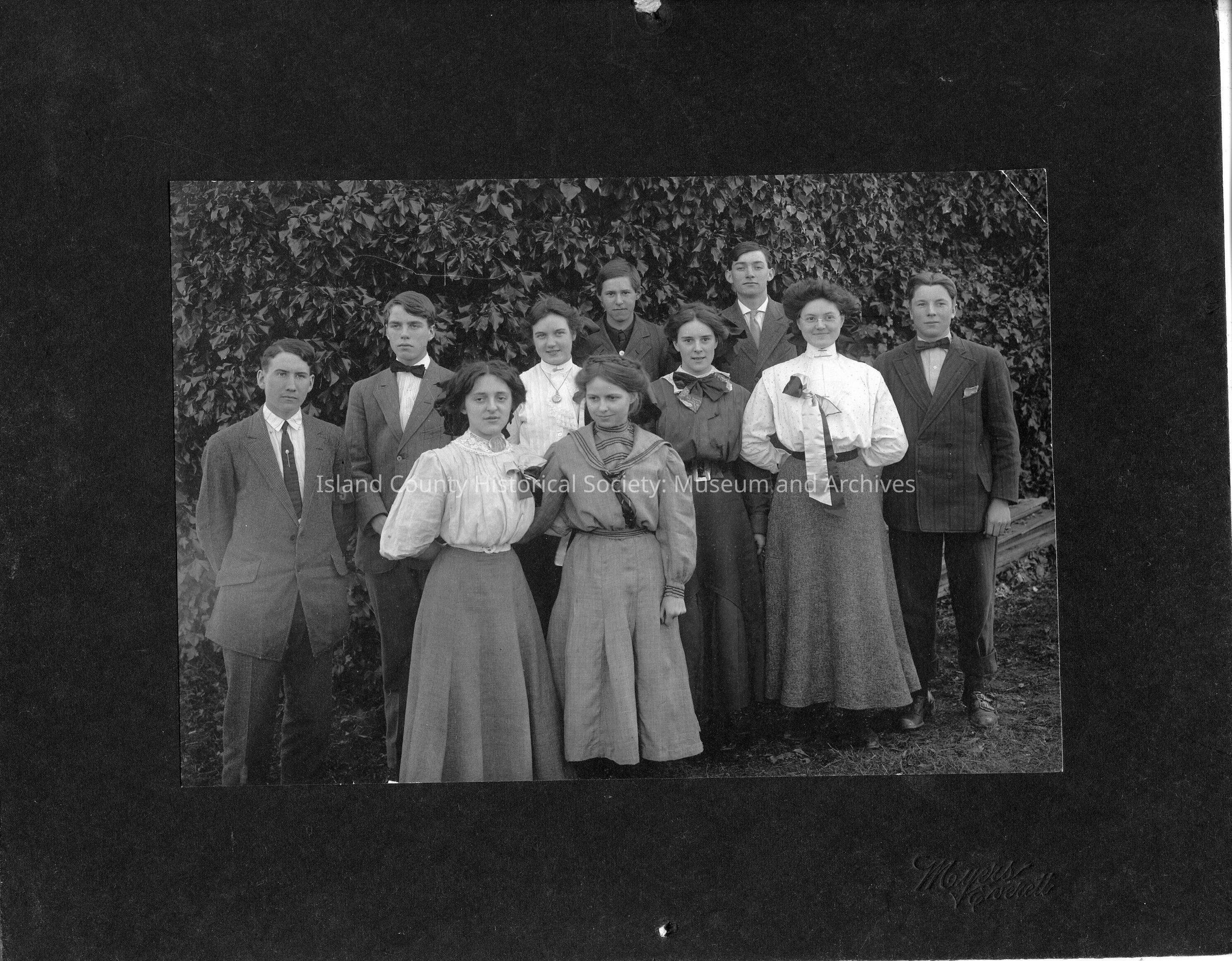 Two copies of a picture of 10 students as sophomores in 1911. Identified on back: (Left to Right) M. Dean, F. Morrill, M. Black, M. Terr, D. Craddock, F. Comstock, M. Fisher, Wm. P. Race, Z. Vaden, Owen Lovejoy, Will Race rear right. Alternatively: Front row: Mamie Black, Doris Craddock, Madeline Fisher, unknown Back row: Merlin Dean, Frank Morrill, Marie Terry, Ray Comstock, Will Race, Owen LovejoyLexicon
