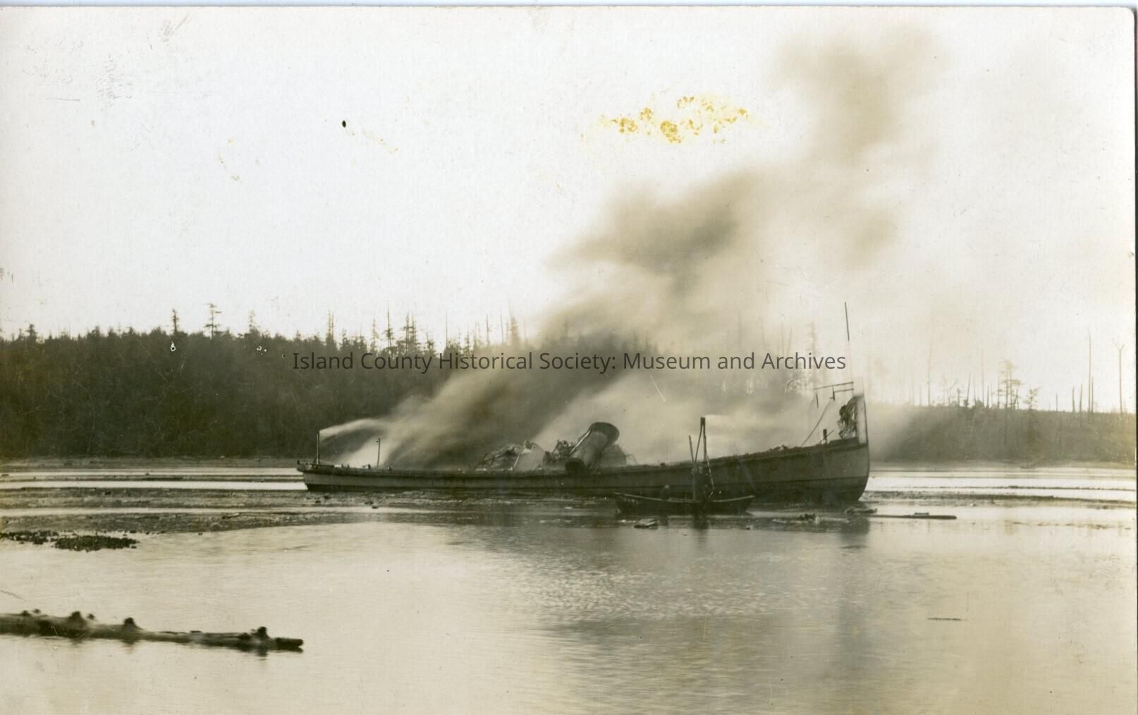 This photo is black and white on a postal card. On the reverse side, written words are: "Whidby 1911 as it burnet off", The boat continues to burn and a second boat is in the foreground, likely monitoring the progress of the fire. The Whidby caught fire on May 9, 1911, while in dock at Oak HarborDimensions
